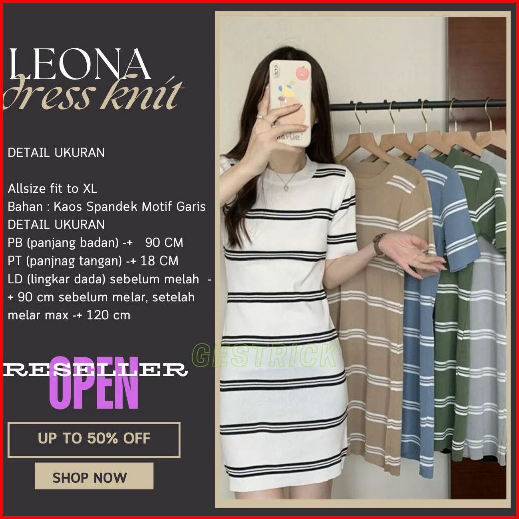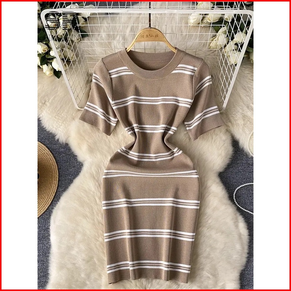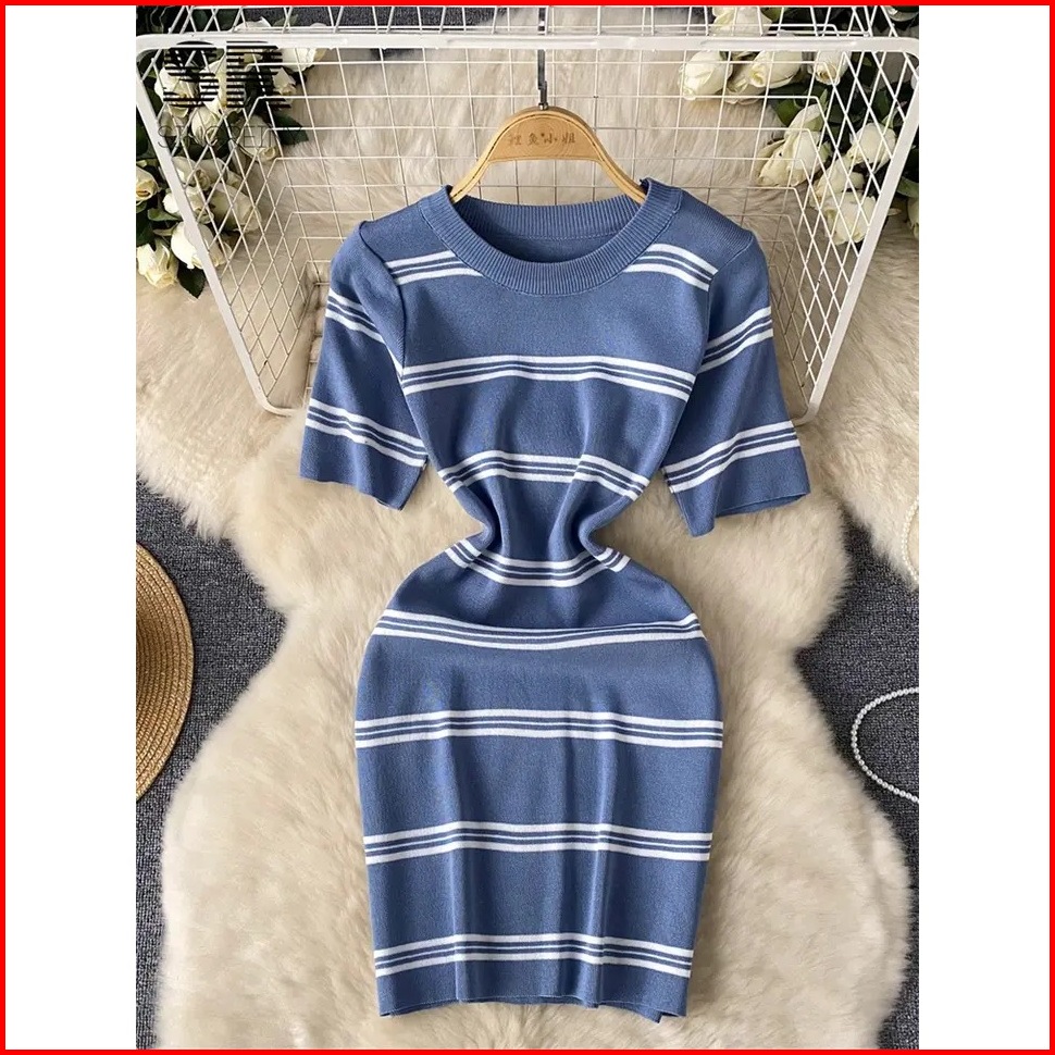 Leona Gaun Pendek Rajutan Strip Gaun Mini Ramping Korea Bodycon Elastis Lengan Pendek - Gestrick