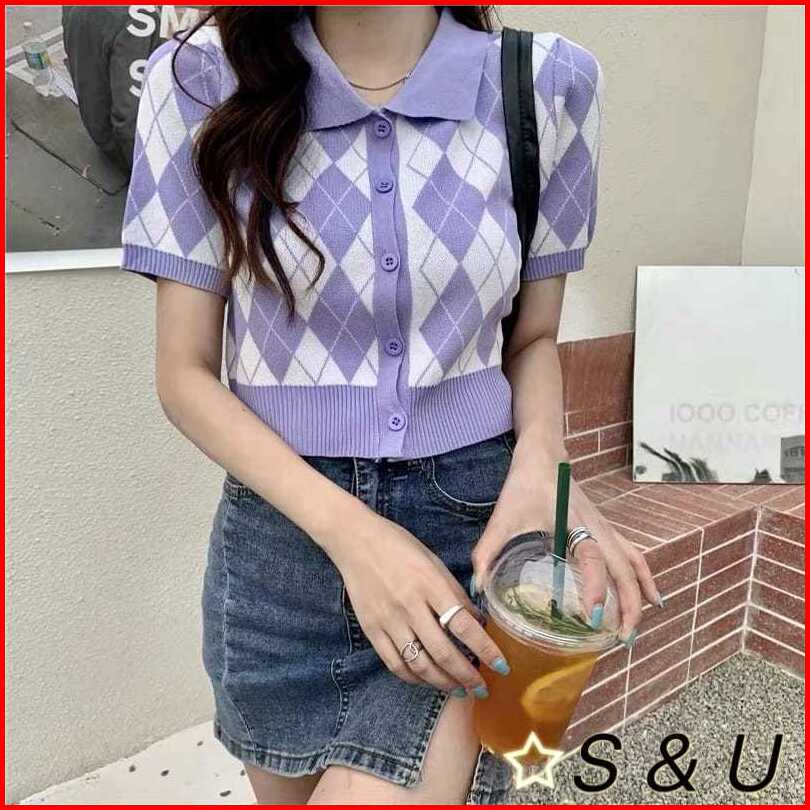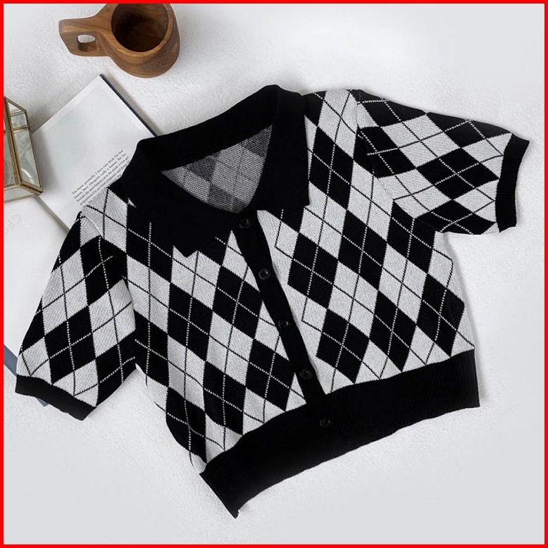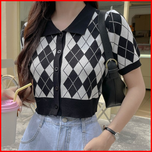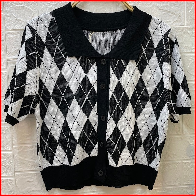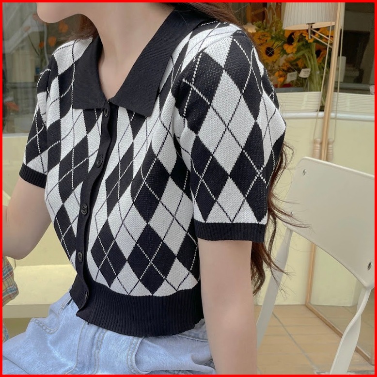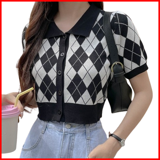 Tshirt Retro Crop Cardigan Kancing Hidup-atasan Kerah Polo Bermotif