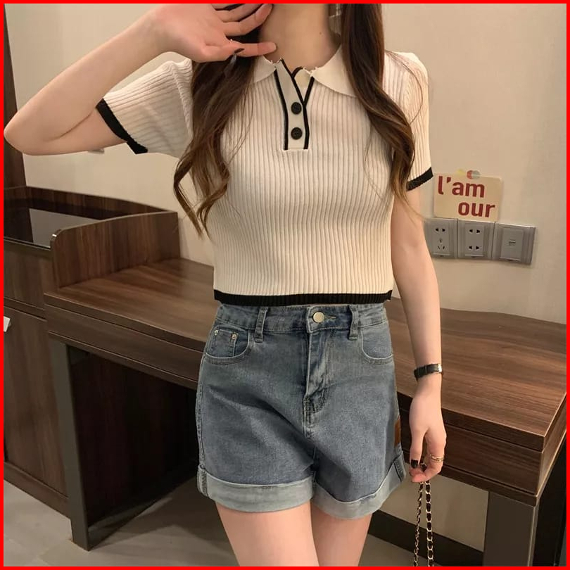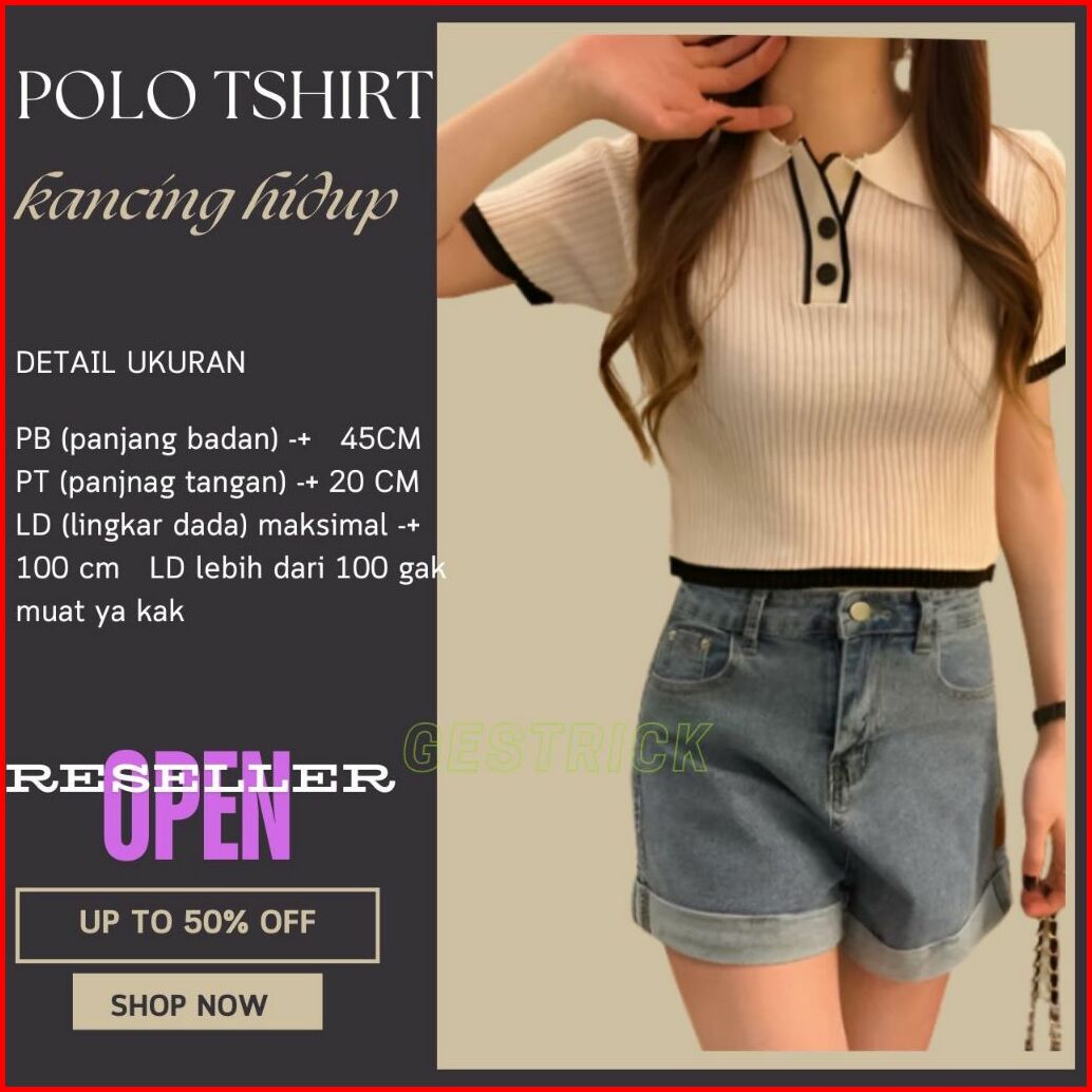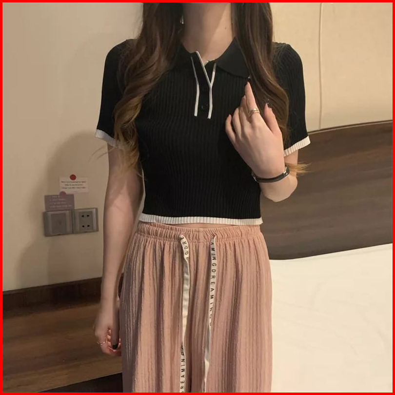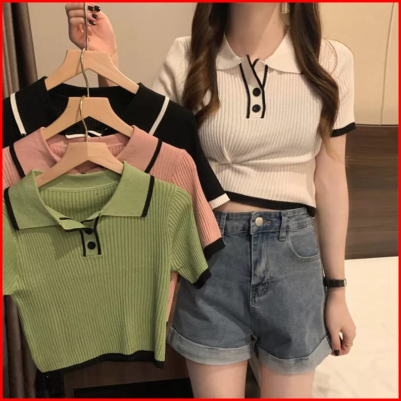 Kaos Kerah Polo Crop Top Rajutan Harajuku Pakaian Crop Wanita T-shirt Putih Solid Lengan Pendek Shirring Wanita Blus Per