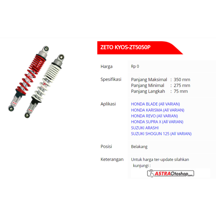 SHOCK BELAKANG SUPRA FIT SUPRA X 125 KARISMA REVO BLADE SHOGUN 125 SMASH ARASHI KYB ZETO ORI ZT5050 /variasi/modif/Taka Jaya Motor/Official/