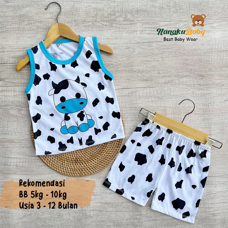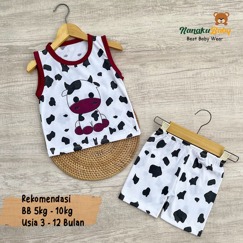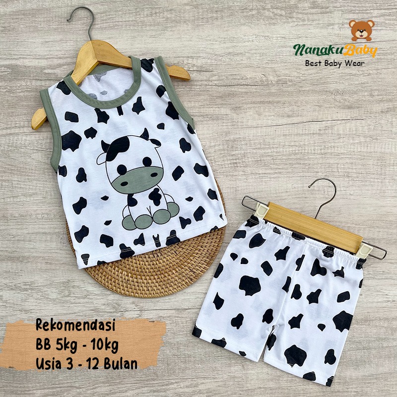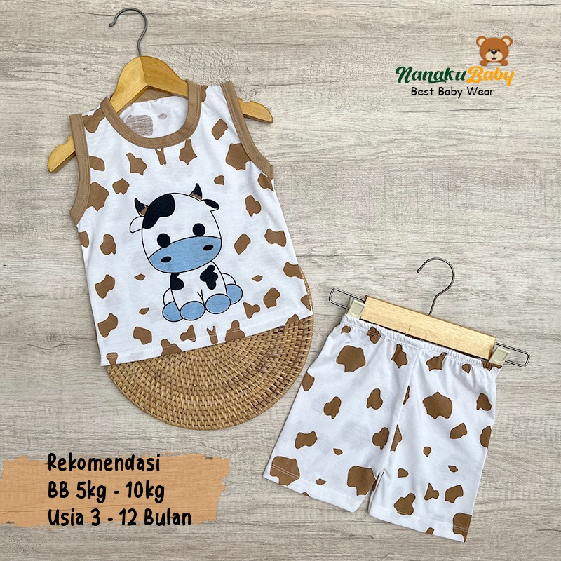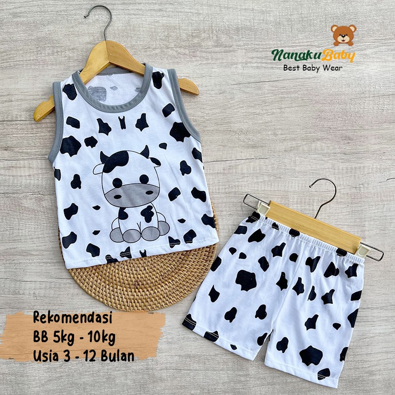 Nanaku Baby - Setelan Bayi Laki Laki & Perempuan Model Lengan Singlet Celana Pendek Usia 3-12 Bulan Motif Sapi