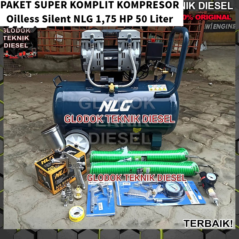PAKET SUPER KOMPLIT KOMPRESOR Oilless Silent NLG 1,75 HP 50 Liter Original OL1390SS