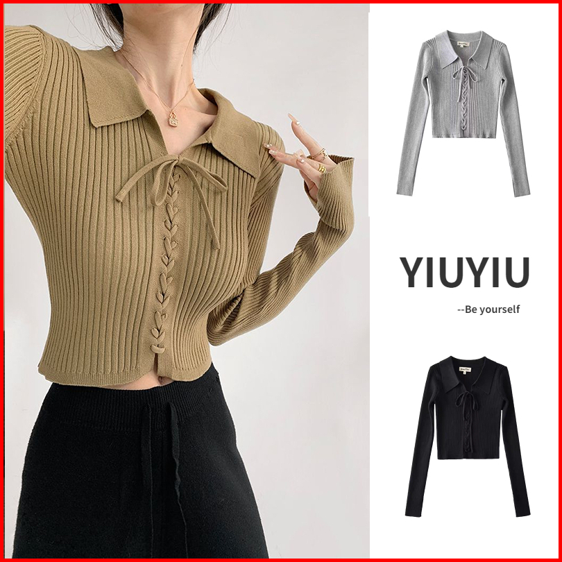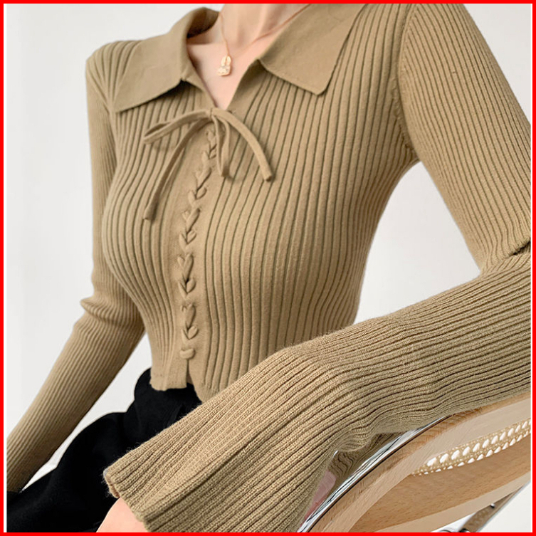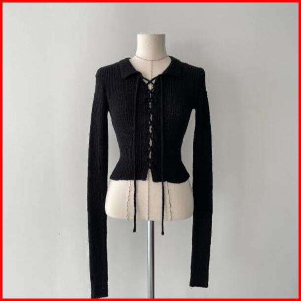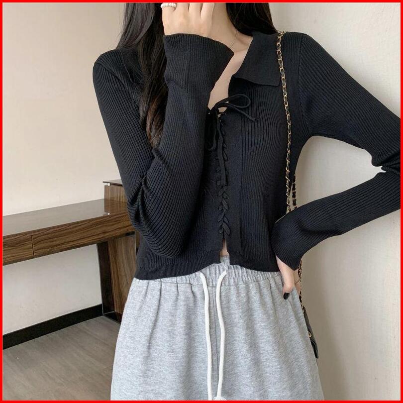 Yiu Yiu Rajut - Import Polos Atasan Wanita Ramping Bertali Rajut Lengan Panjang Casual Top