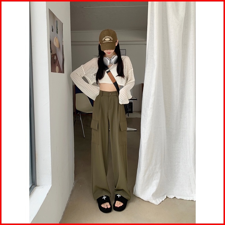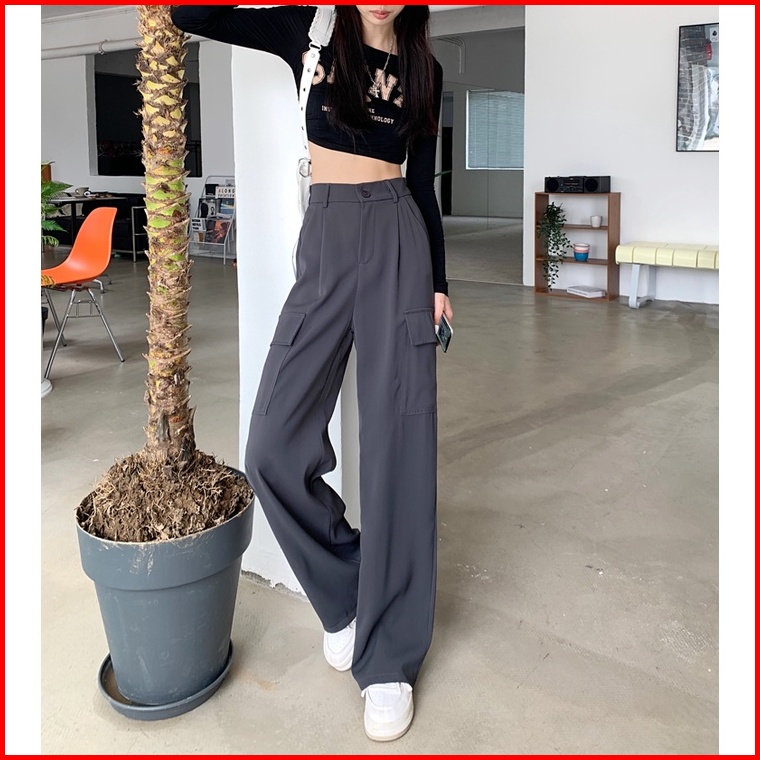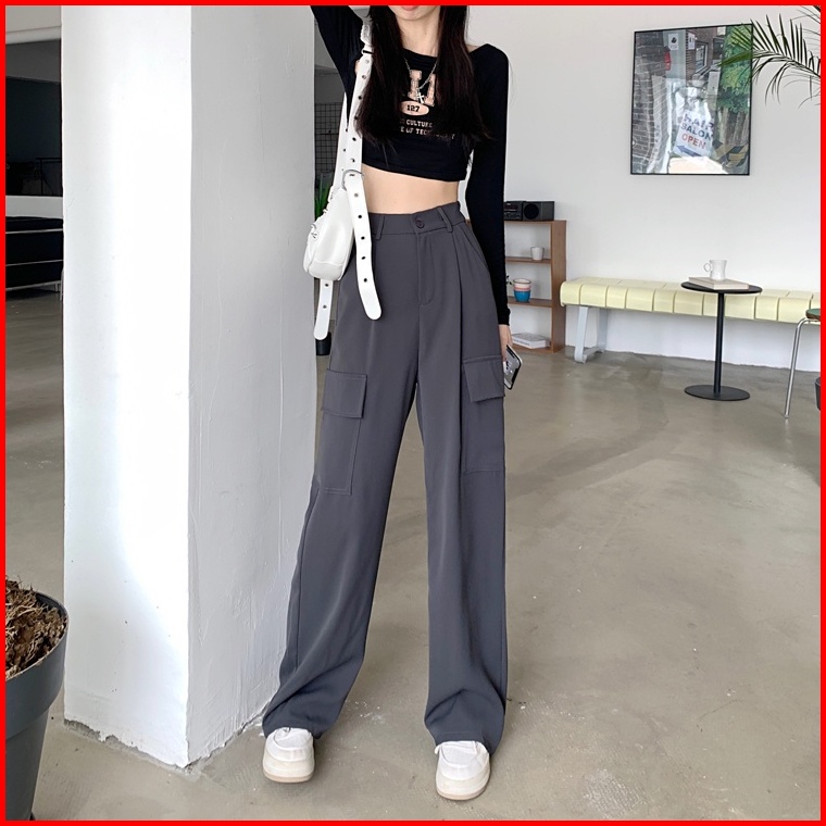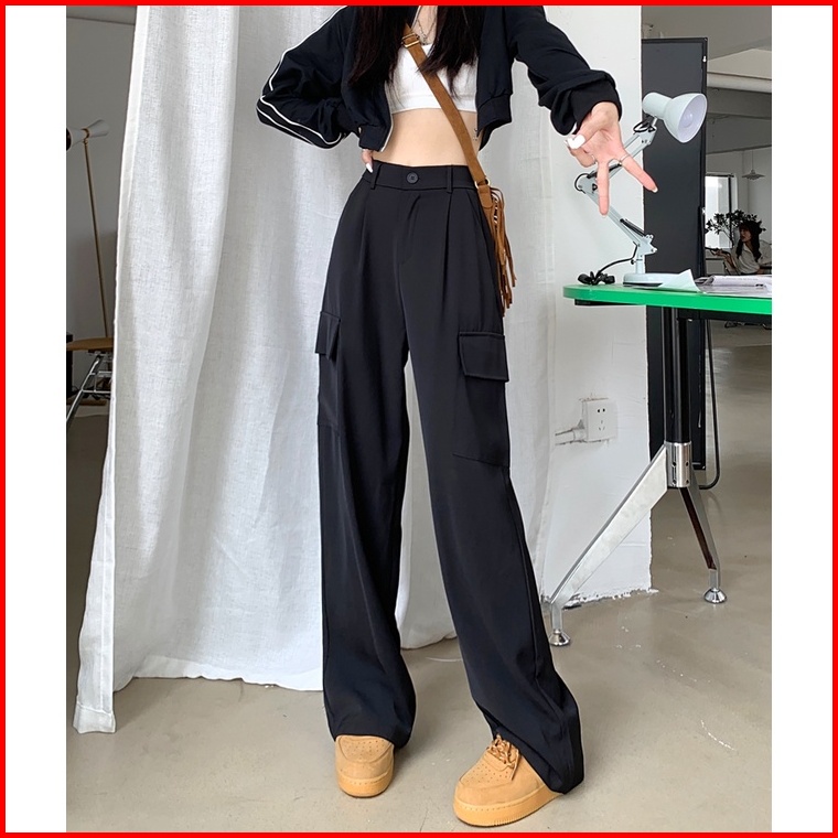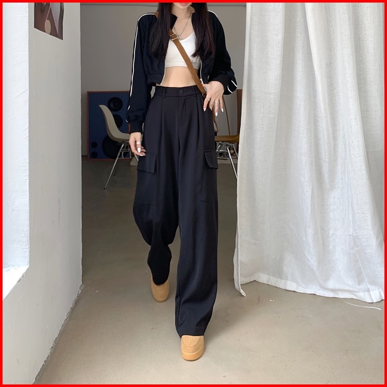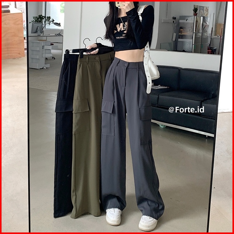 Cargo Pants Wanita Casual Highwaist Celana Cargo Hitam Korean Style Celana Kulot Kekinian