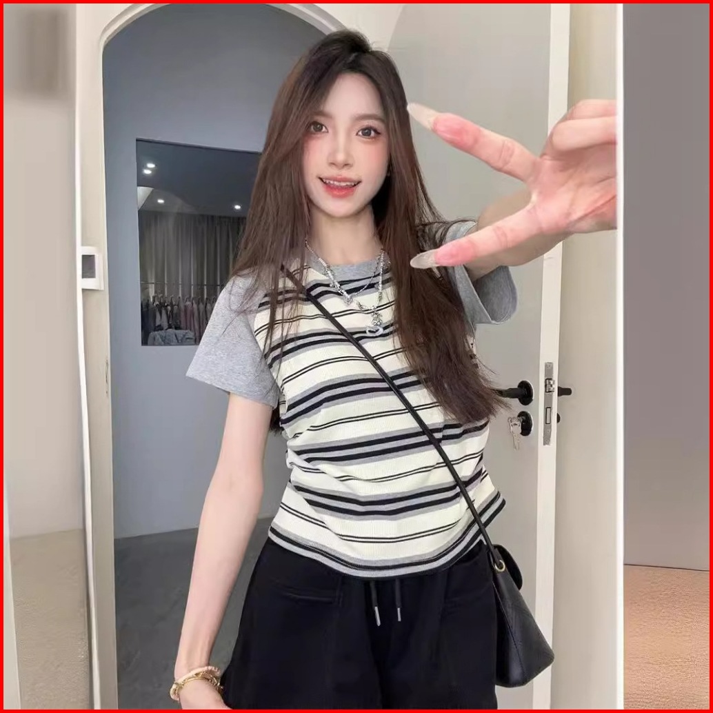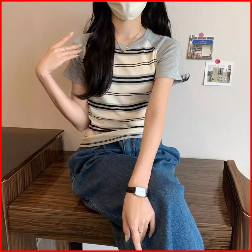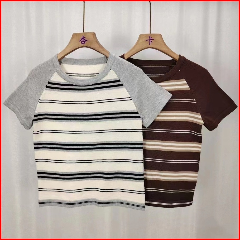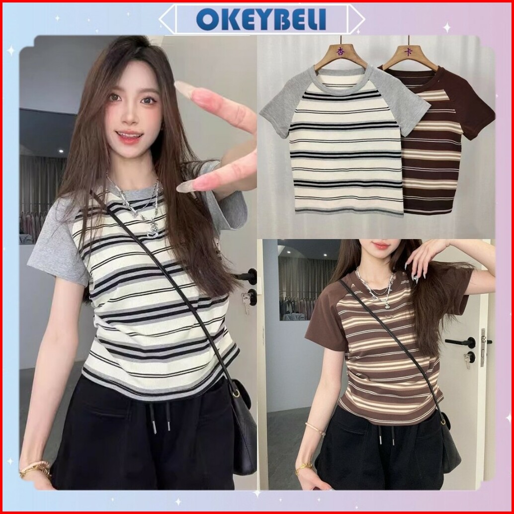 Okey Belibj1741 Baju Atasan Kaos Fashion Korea Motif Garis Katun Wanita Fashion Lengan Pendek