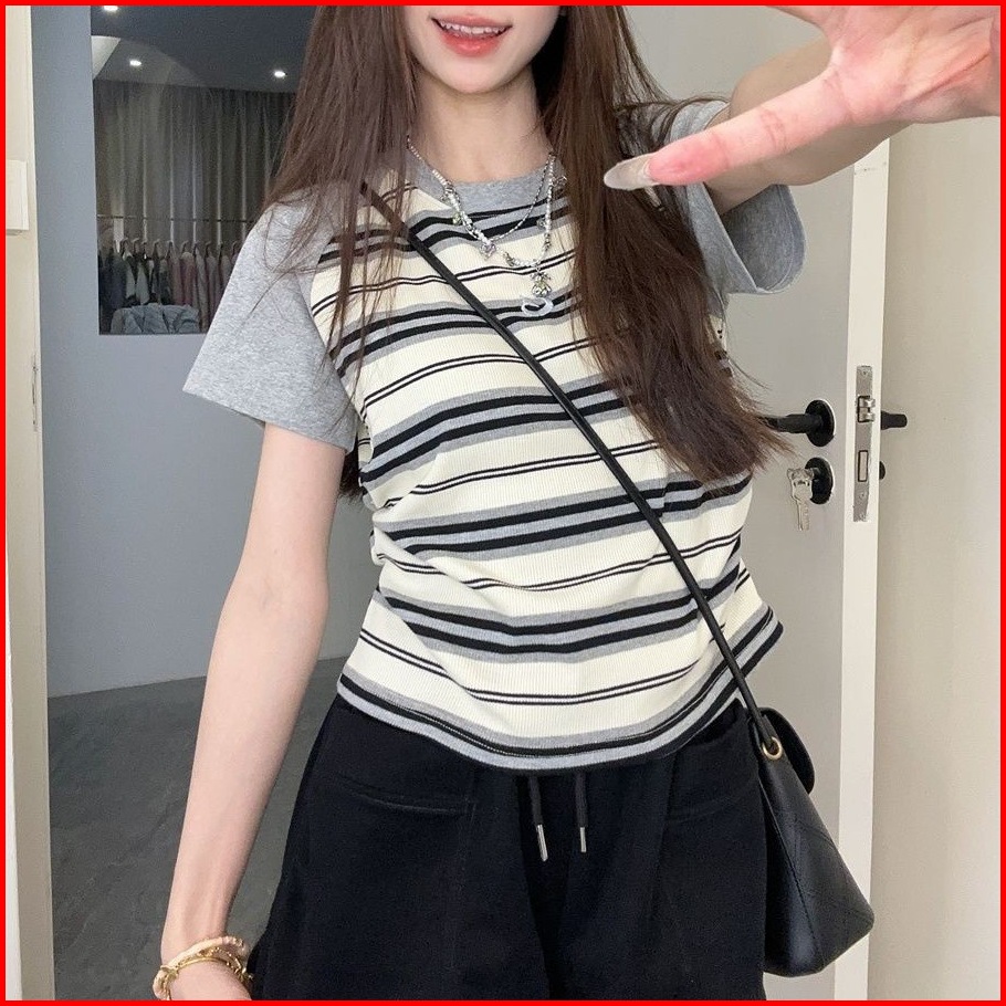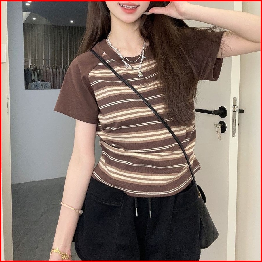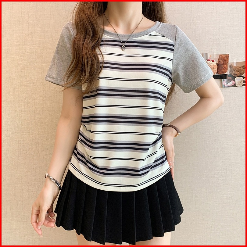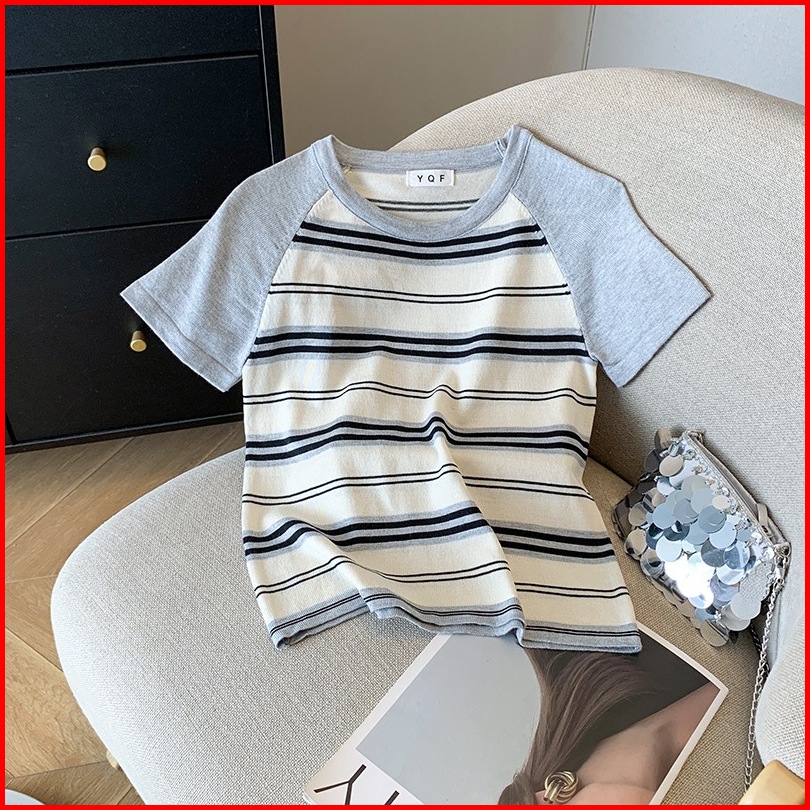 Okey Belibj1741 Baju Atasan Kaos Fashion Korea Motif Garis Katun Wanita Fashion Lengan Pendek