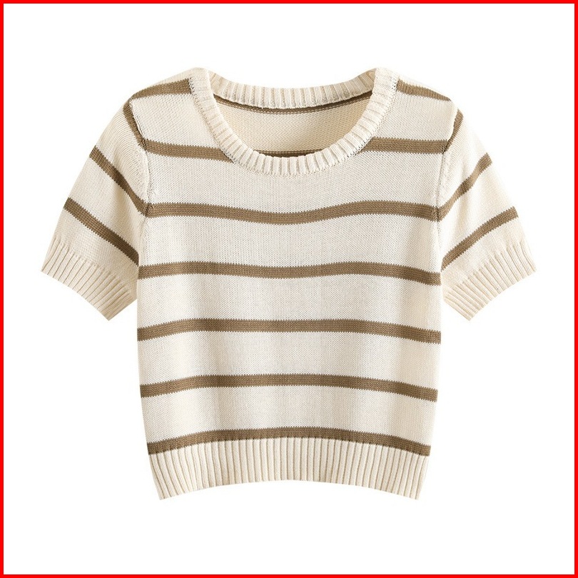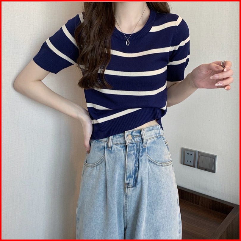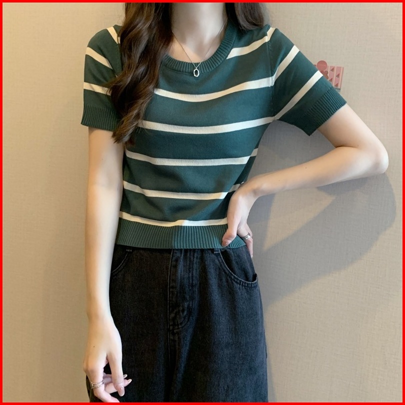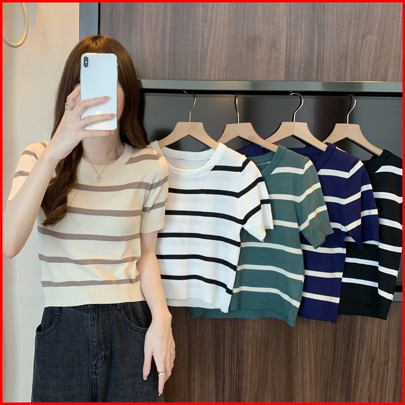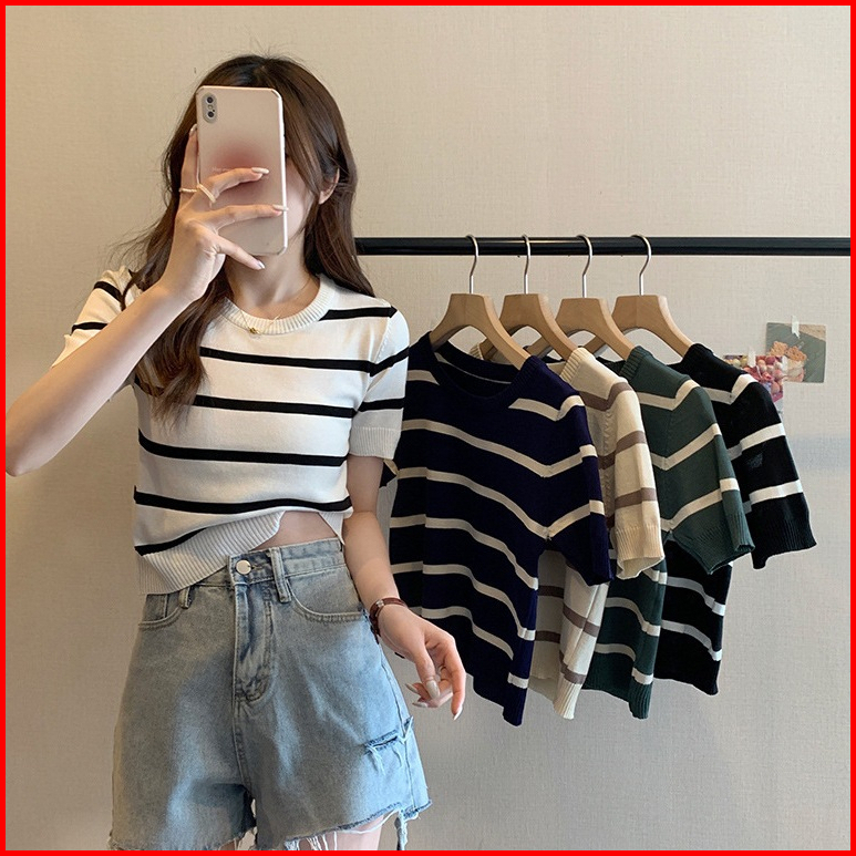 Miss O Bj1582 Baju Atasan Kaos Korean Motif Garis Garis Wanita Fashion Lengan Pendek Fashion