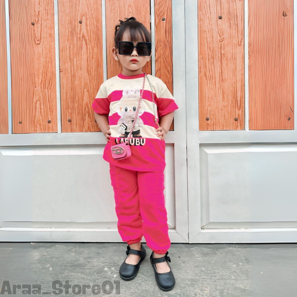 BAJU SETELAN LABUBU ANAK PEREMPUAN CELANA JOGER KARGO USIA 3 SAMPAI 12 TAHUN