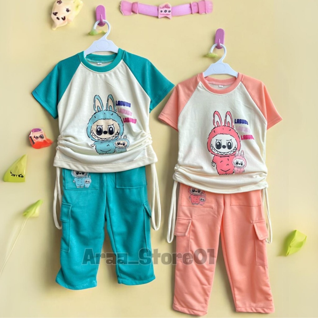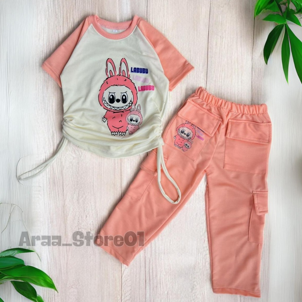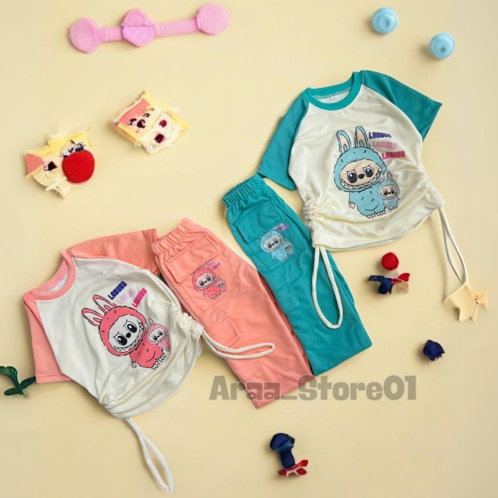 BAJU SETELAN LABUBU TALI SERUT ANAK PEREMPUAN CELANA KARGO USIA 3 SAMPAI 12 TAHUN