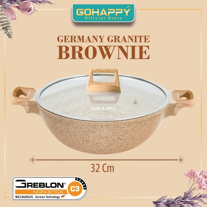 Panci Gohappy Germany Wok 32cm9reblon9ranite Teflon WAJAN Tebal Marbel Coating +Tutup Kaca - ORIGINAL GO HAPPY