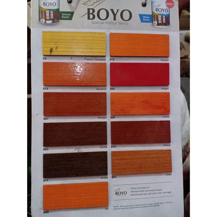 600/jati, 601/sawo, 603/kurma, 606/anggur, 607/manggis, 609/cerry, 610/walnut, 611/akasia, 615/bengkirai, VERNIS/CLEAR