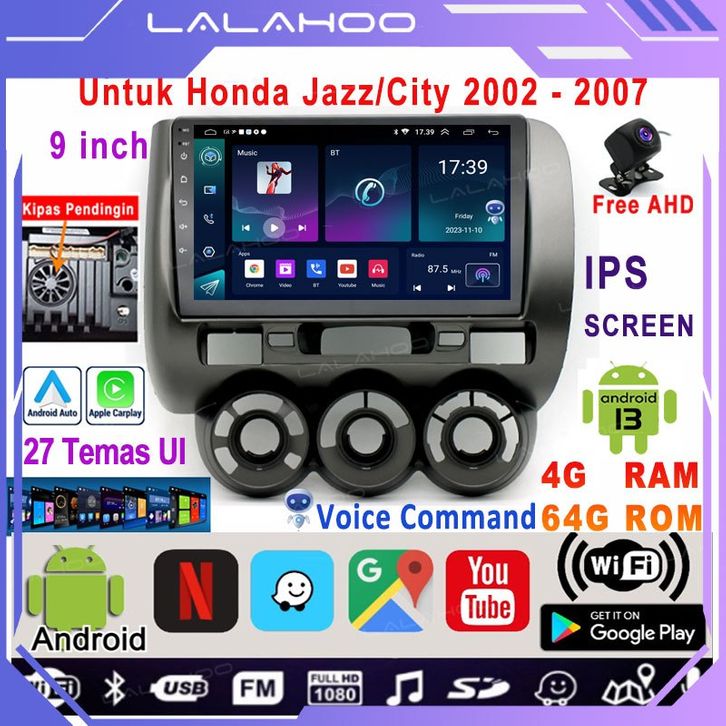 【Ada Kipas Pendingin】9 Inch 4G+64G Android 13 Head Unit Untuk Honda Jazz/City 2002-2007 Termasuk Frame/PNP Soket IPS Sc