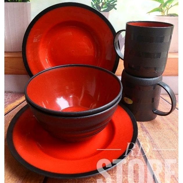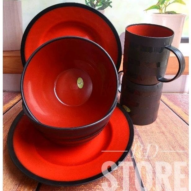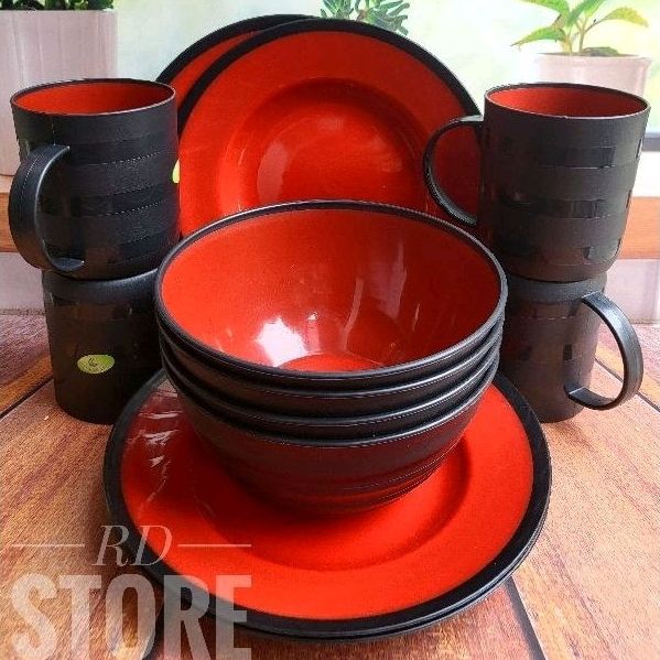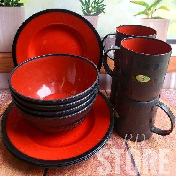 ( HARGA PROMO ) 12.pcs isi 4.piring makan 4.mangkok ramen 4.cangkir gagang multiwarna L.