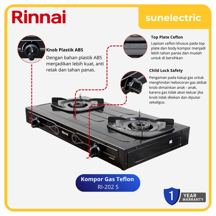 Rinnai RI-202 S Kompor Gas Stove Teflon 2 Tungku RI-202S / RI202 S / RI 202S / RI202S / Kompor 2 Tungku Ceflon / Jenis A