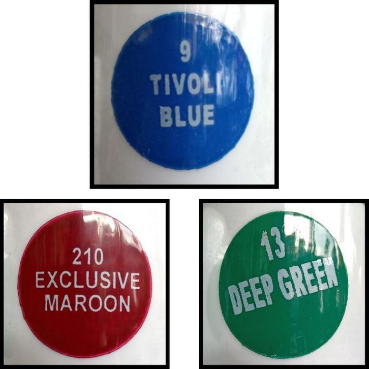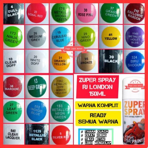 08+1580 ymh red, Biru shogun, Black doff, Black gloss, Blue, Bronze 35, Cerulean blue 19, Clear doff, Clear gloss, Ctm honda blue 1103, Ctm honda yellow, Ctm yamaha red 1108, Curacao blue 216, Deep green, Exclusive maroon, Executive grey 450, Grass green 37, Hino green 29, Hitam metalik, Indigo blue 502, Maroon, Medium grey, Met laguna green, Met light green, Met neon blue, Met ocean blue 1147, Met pearl white, Met shogun green 176, Met silver, Met super green, Met violet blue, Met. Neon green 193, Ninja green, Orange 14, Orange yellow, Rose pink 30, Signal red, Silver, Silver red 6, Tivoli blue, White doff, White gloss, Yellow