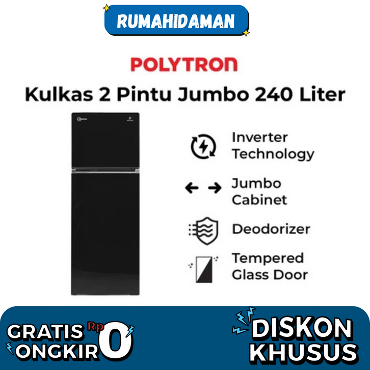 POLYTRON Kulkas 2 Pintu Terbaru Tanpa Bunga Es Jumbo INVERTER 240L INVERTER PRW 25VX PRW25VX GARANSA RESMI