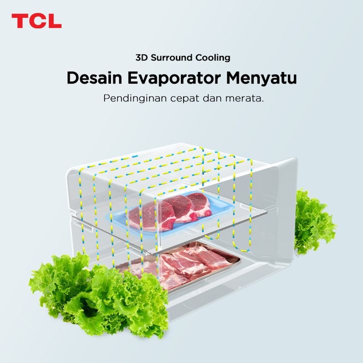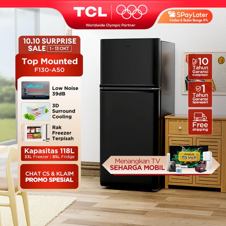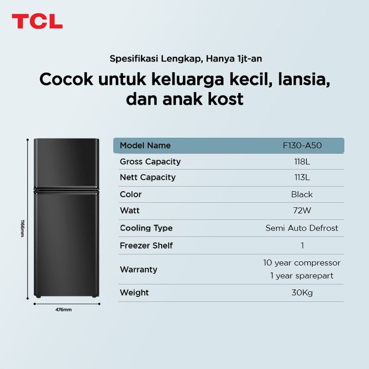 TCL Kulkas 2 Pintu (F130-A50) - Kapasitas 118L - Rak Freezer Terpisah - 3D Surround Cooling - Adjustable shelves - Low N
