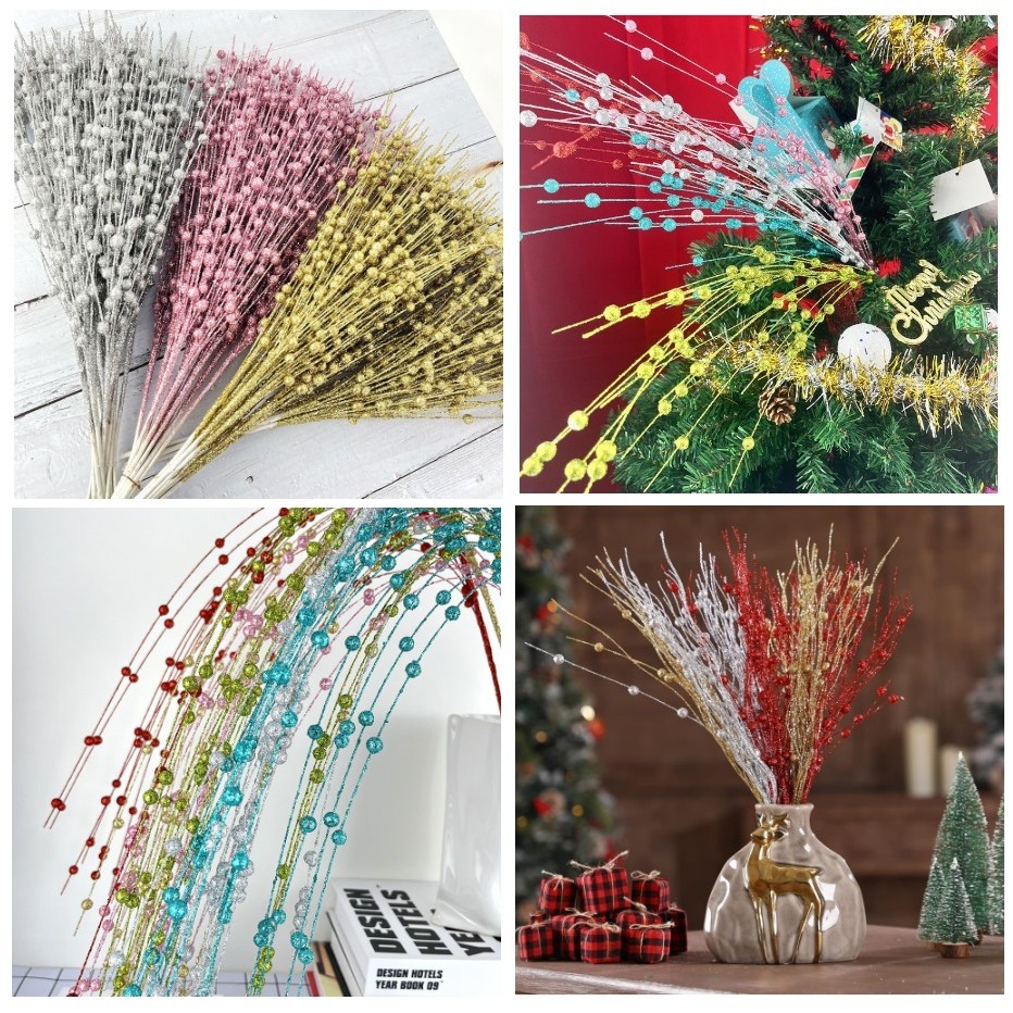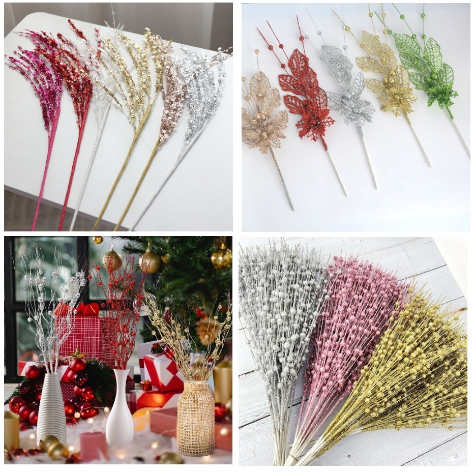 Aksesoris Natal Daun dan Akar Artficial Plants Leaf Mix Cherry Glitter Warna Warni Ornamen Merry Christmas