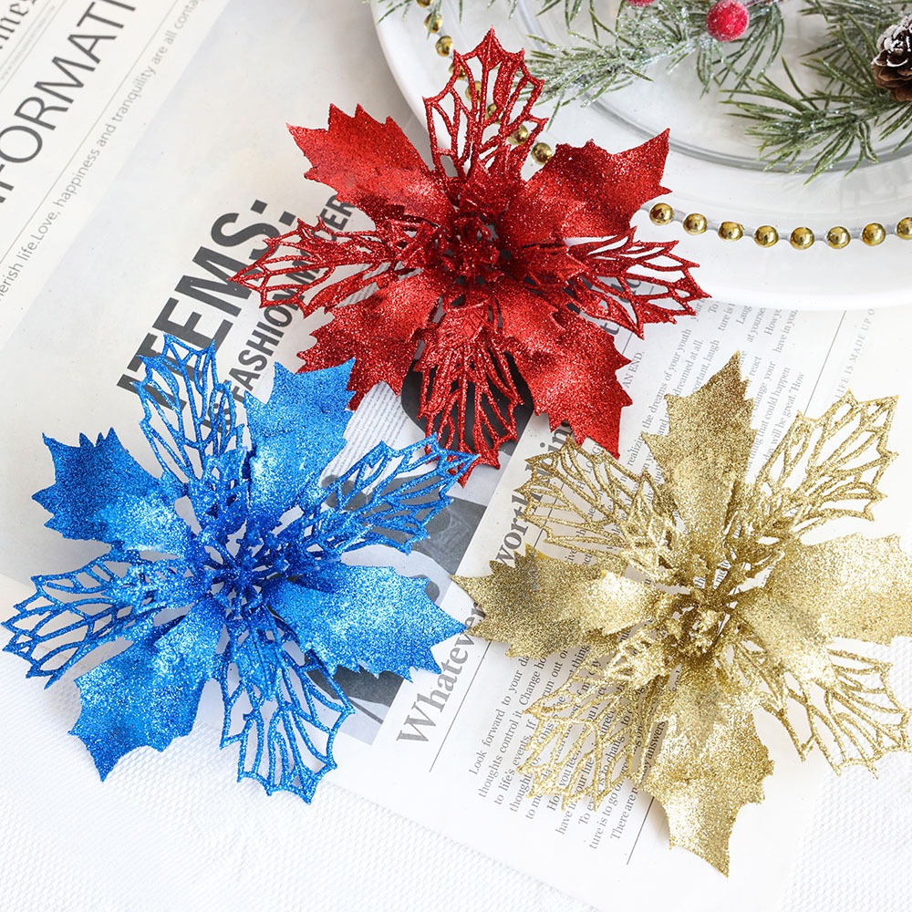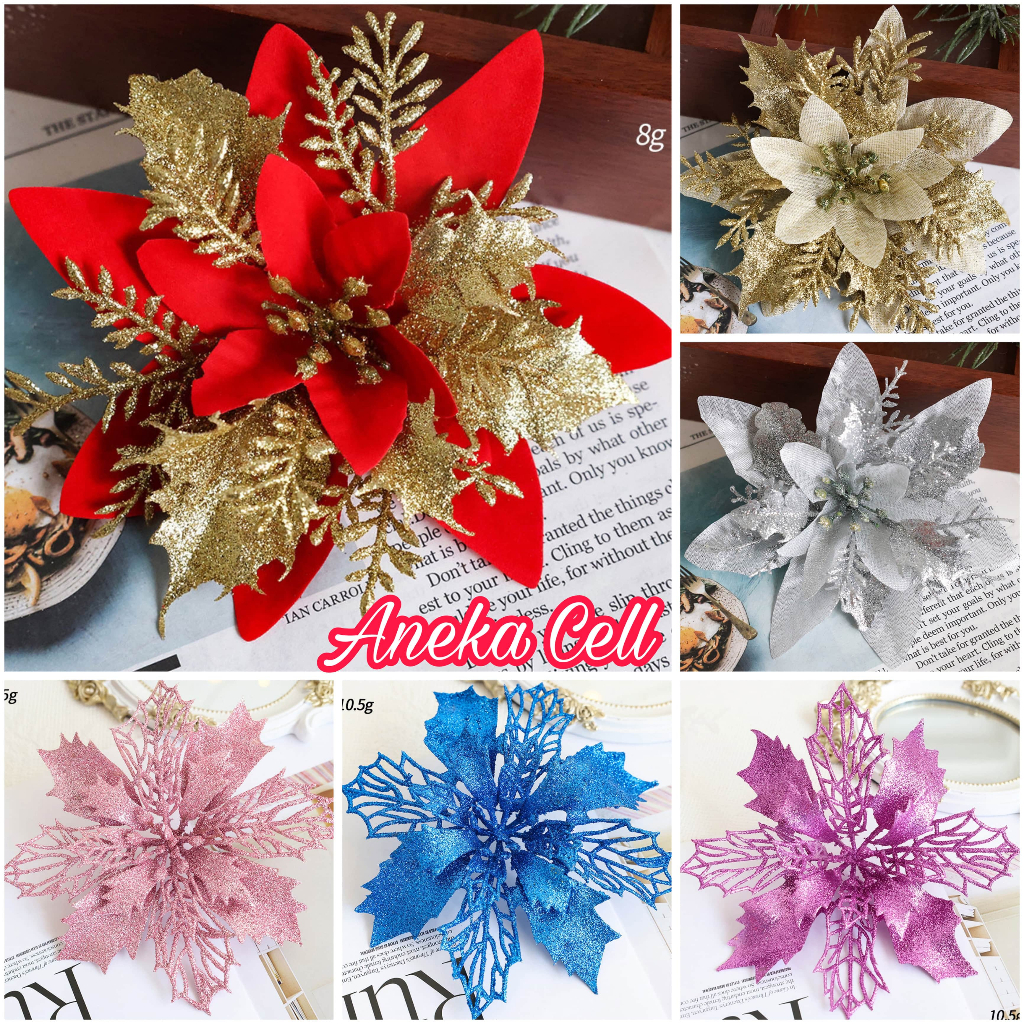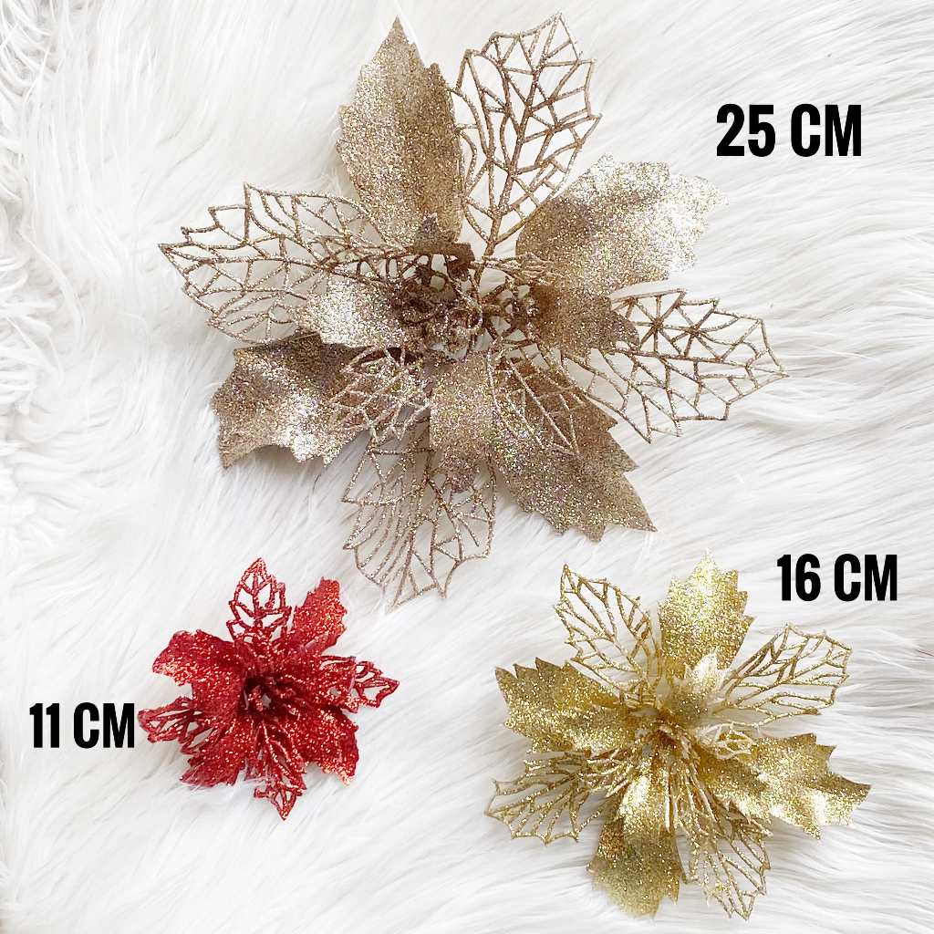 Hiasan Bunga Kastuba Poinsettia Glitter Artificial Gantungan Hiasan Dekorasi Ornamen Pohon Natal Christmas 23cm 16cm 11cm