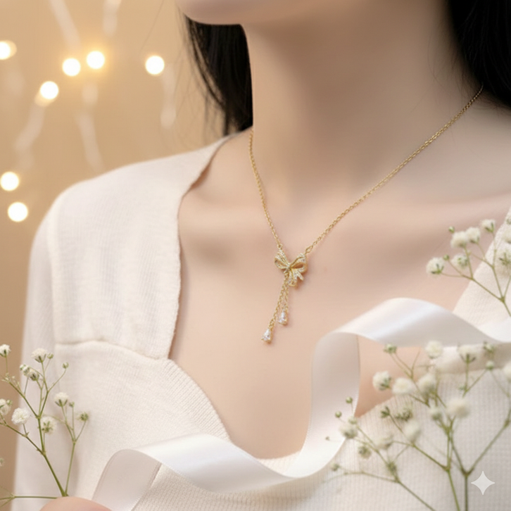 Kalung Titanium Desain Pita Jurai Korea Elegan Perhiasan Wanita Anti Karat Anti Luntur Kalung Fashion Cute Hadiah Couple