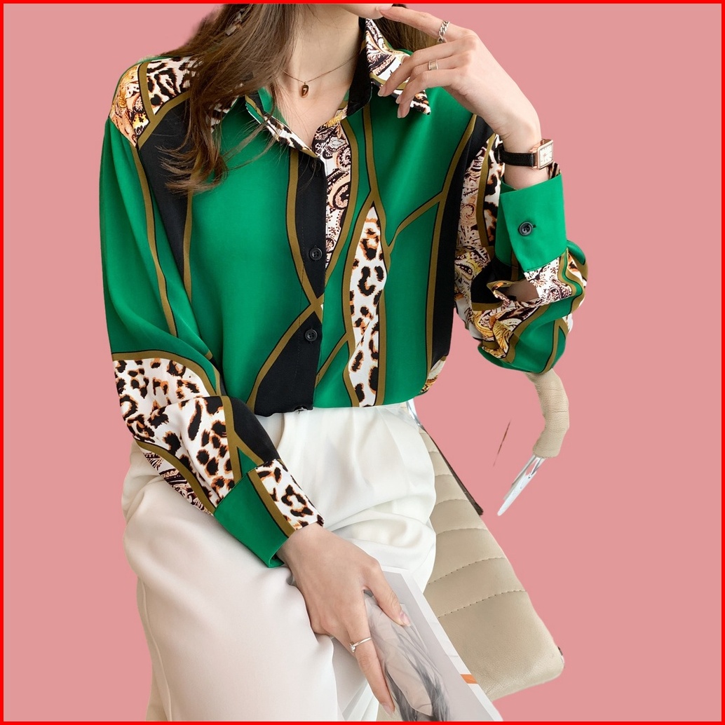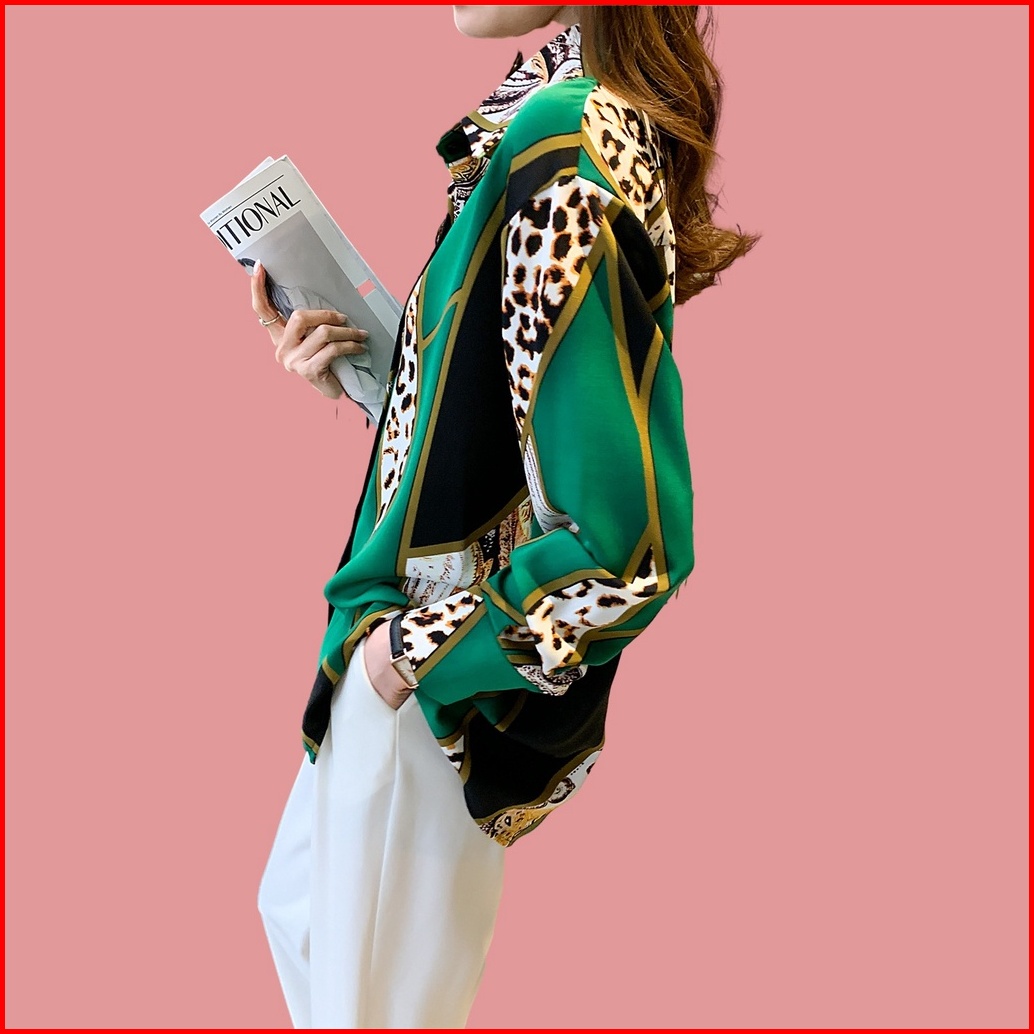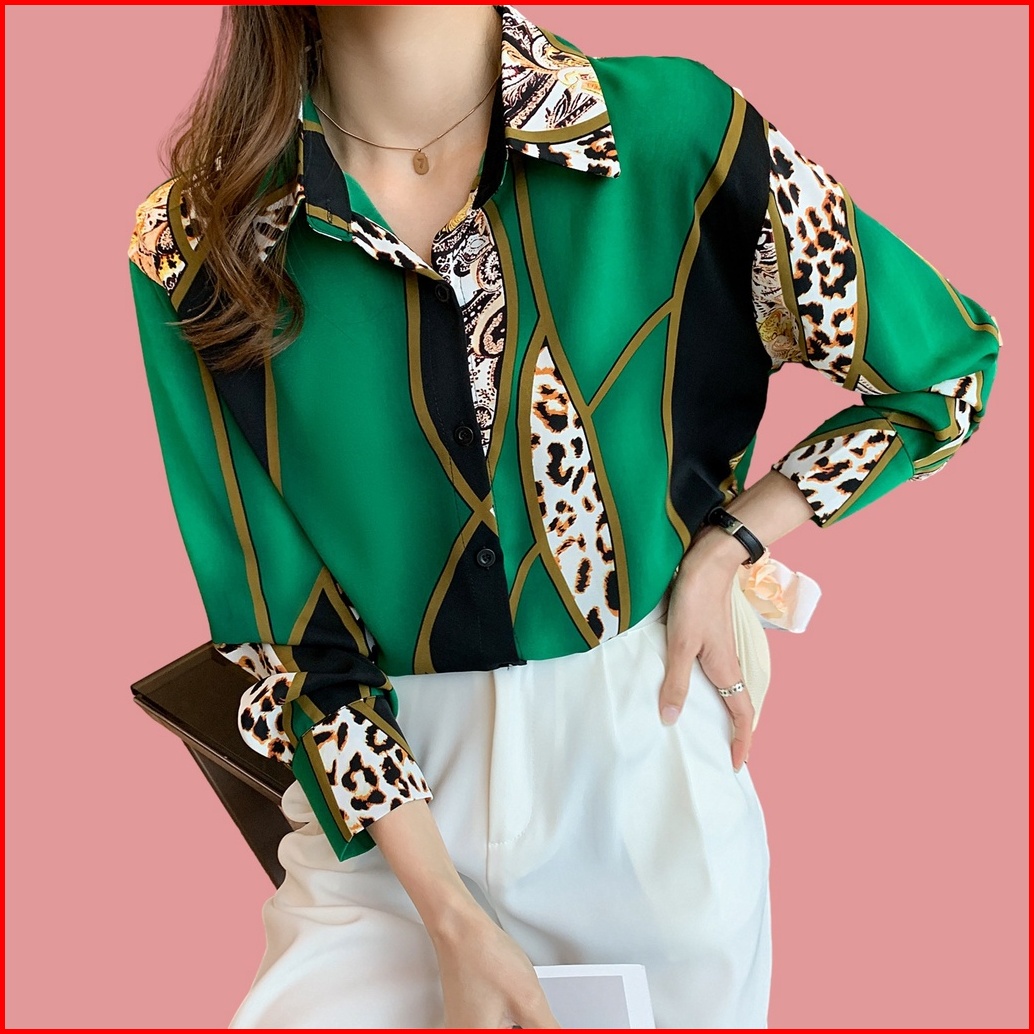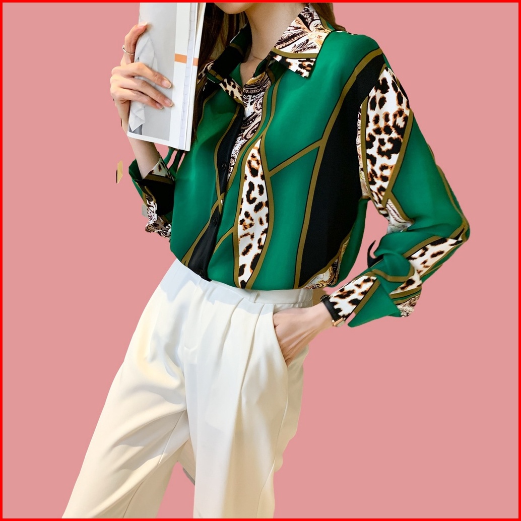 New Fashion Korean Style High Quality Fabric Green Geometric Pattern Chiffon Women Long Sleeve Shirt Ol Office Casual Lo