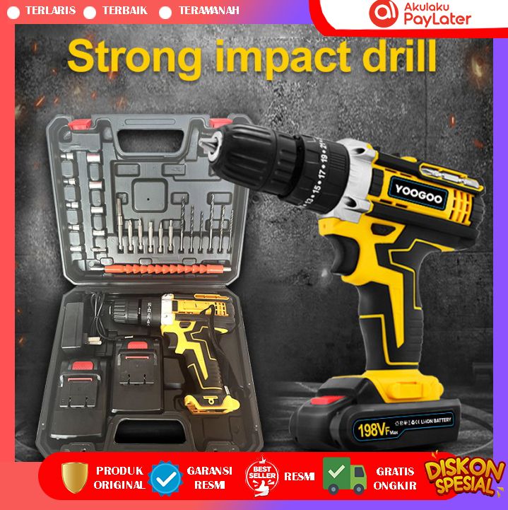 CICILAN/DP% MESIN BOR TANGAN CORDLESS ELEKTRIK 198VF YOOGOO DRILL SET KOMPLIT - 2 BATERAI