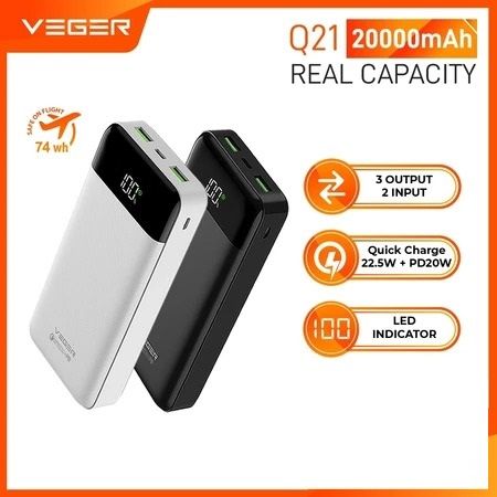 VEGER Powerbank Q21 20000mAh LED Digital Display Fast Charging Quick Charge 22.5W PD 20W Power Bank