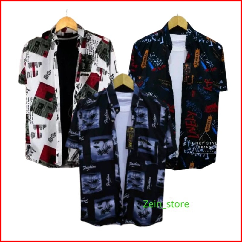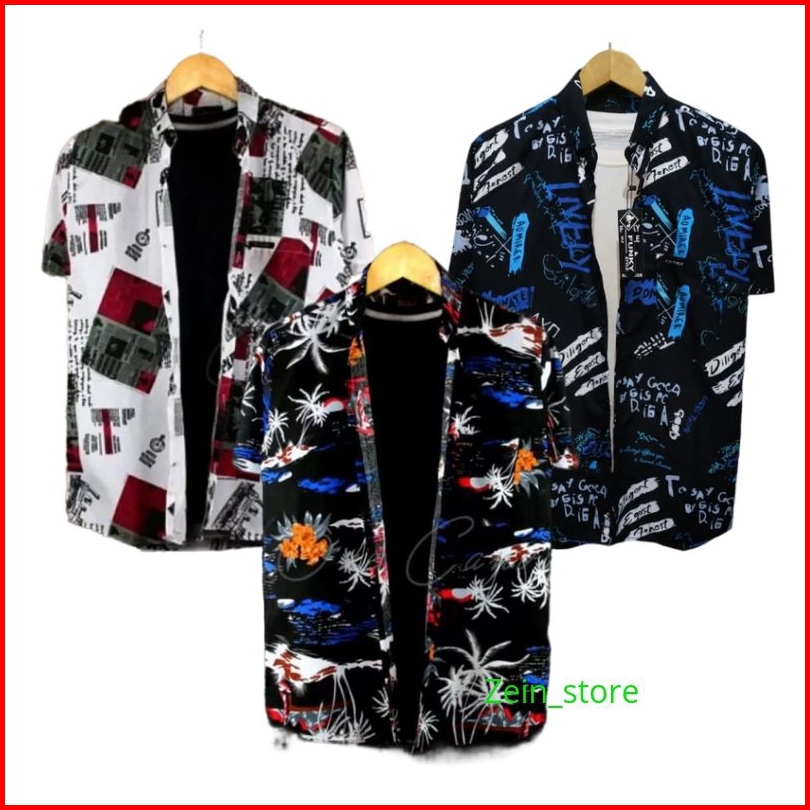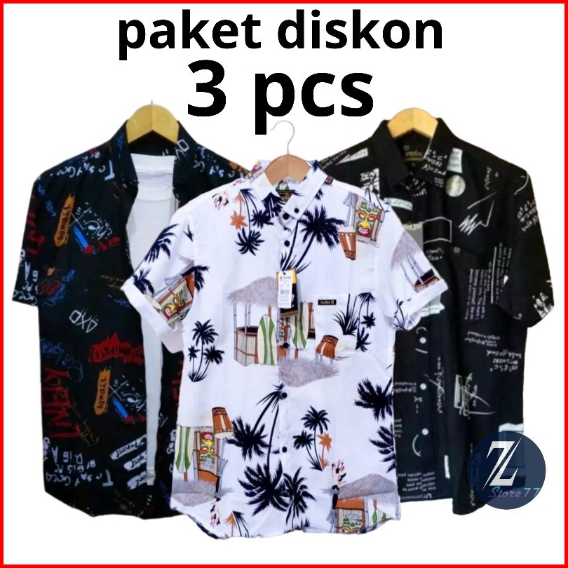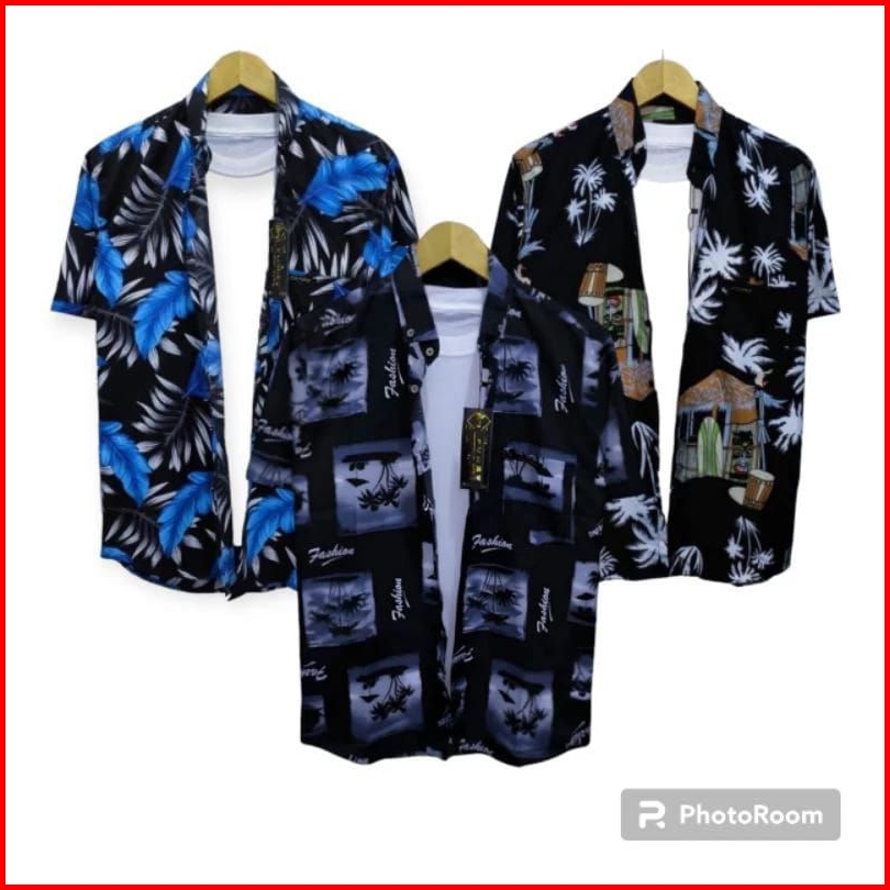 Paket 3 Pcs Kemeja Motif Pantai Hem Motif Lengan Pendek Baju Surfing Pria Original Distro Premium Casual Full Printing