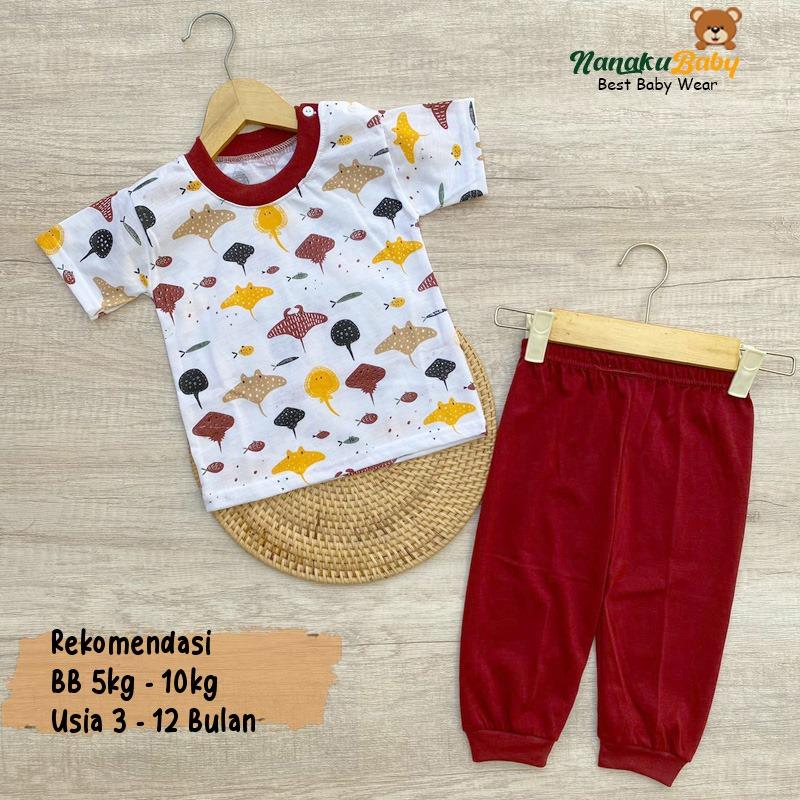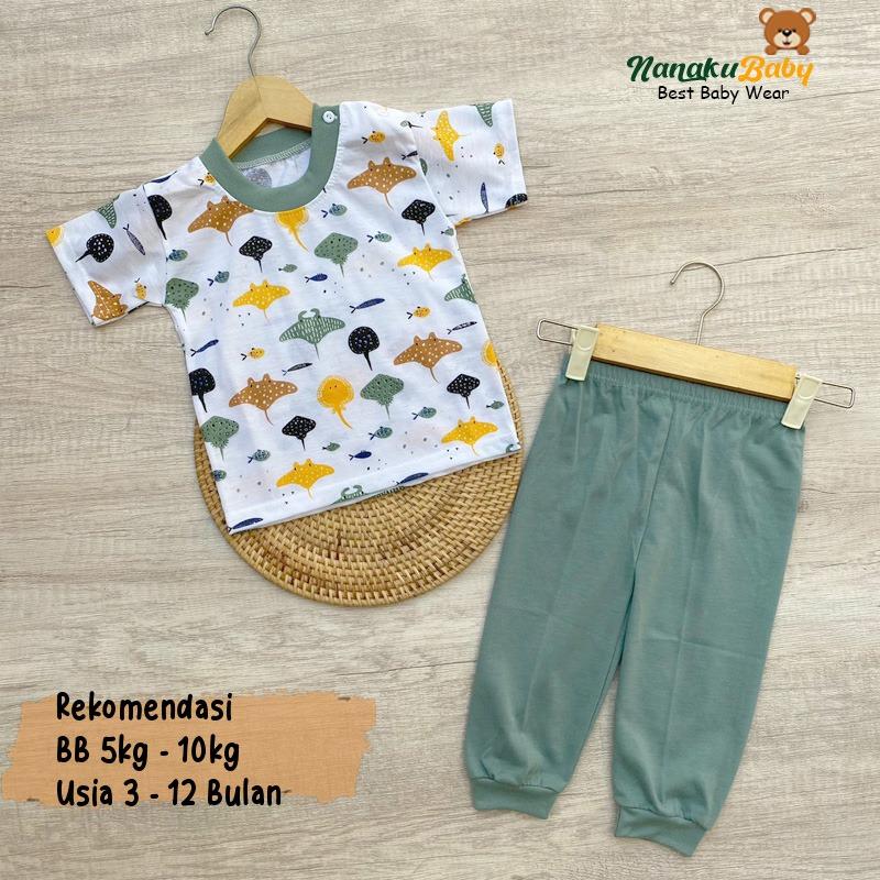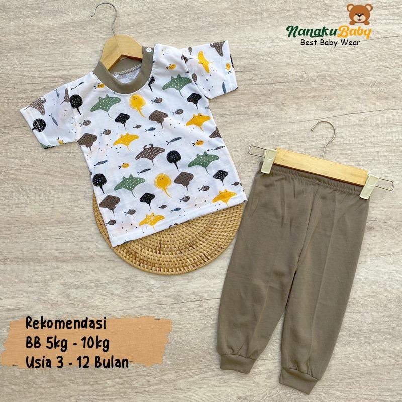 Nanaku Baby - Setelan Baju Bayi Lengan Pendek Celana Panjang Setelan Harian Motif Ikan Pari Rekomendasi Usia 3-12 Bulan