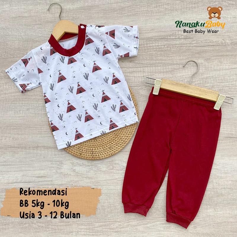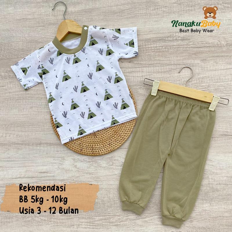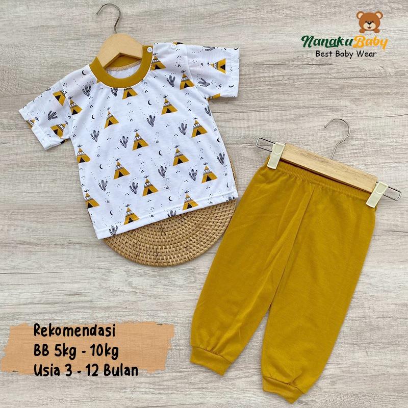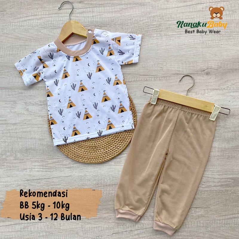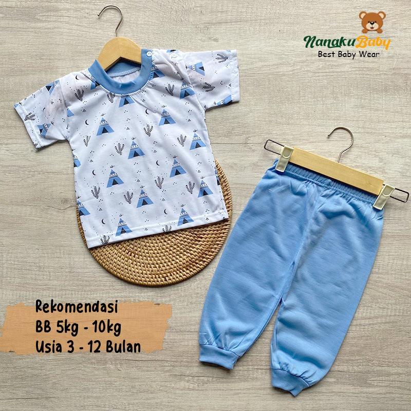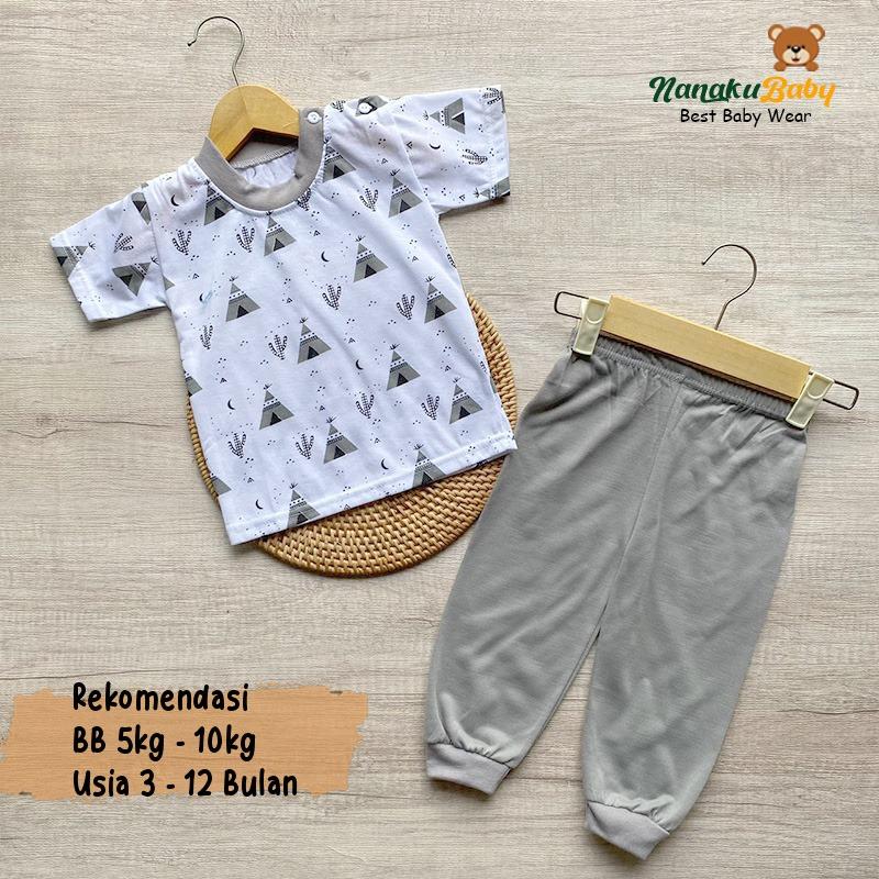 Nanaku Baby - Setelan Baju Bayi Piyama Bayi Lengan Pendek Celana Panjang Kancing Pundak Usia 3-12 Bulan Motif Piramida