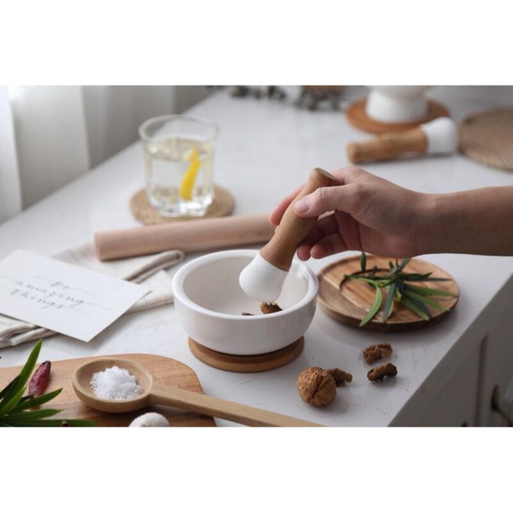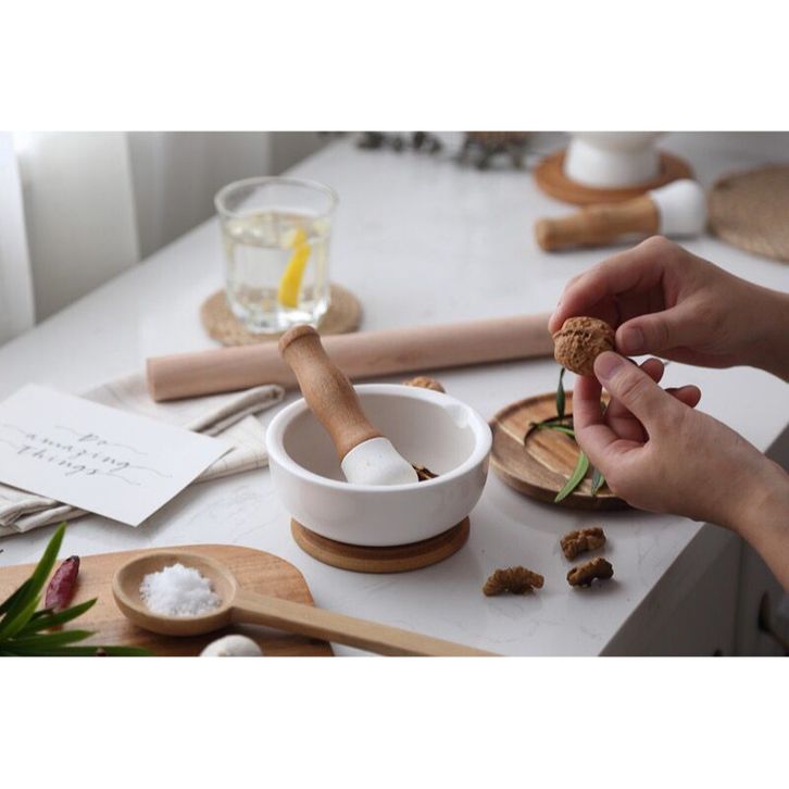 Lesung Keramik Ulekan Penggiling Cabe Merica dengan Tatakan Kayu