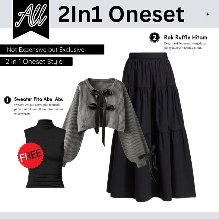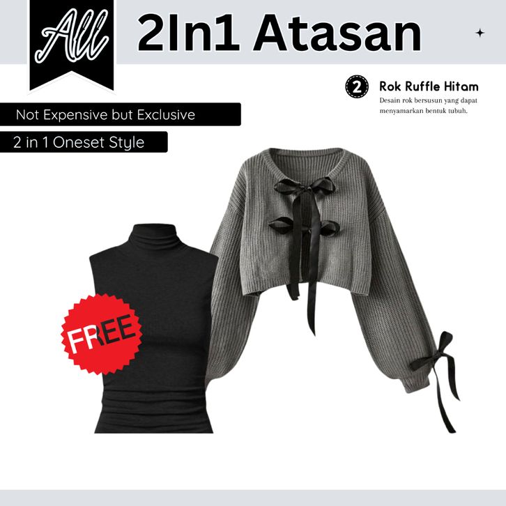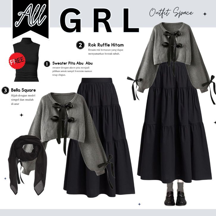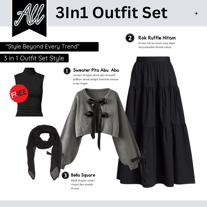 One Set Wanita Kekinian Cardigan Coquette Rajut Rok Ruffle Hitam Hyget Hijab Bella Square Setelan Wanita Kekinian OS08