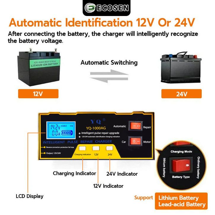 ECOSEN Charger Aki 12V/24V 6-105AH Smart Battery Charger Mobil Motor/Case Aki Mobil/Case Aki Motor/Cas Aki/Case Aki