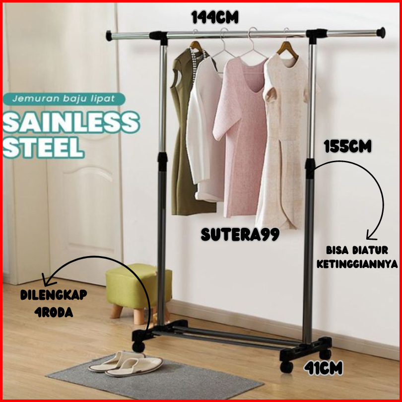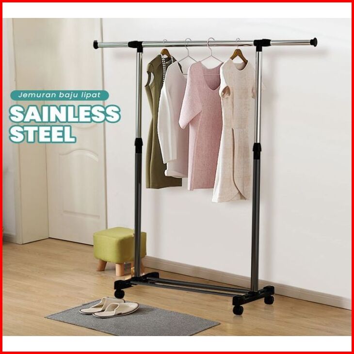 Sutera99 Stand Hanger Single Hitam Rak Gantungan Baju Serbaguna Dengan 4 Roda Single Rack Stand Cloth Hanger Jemuran Sta