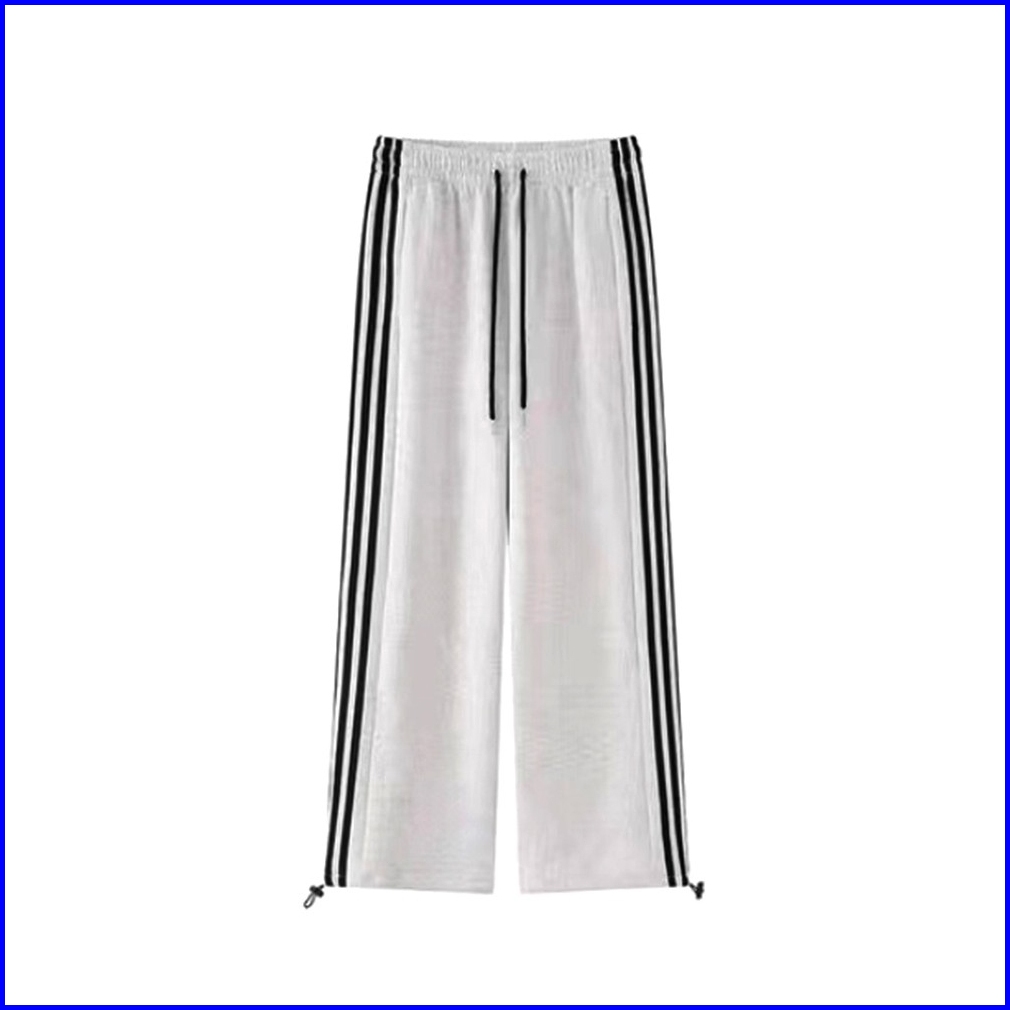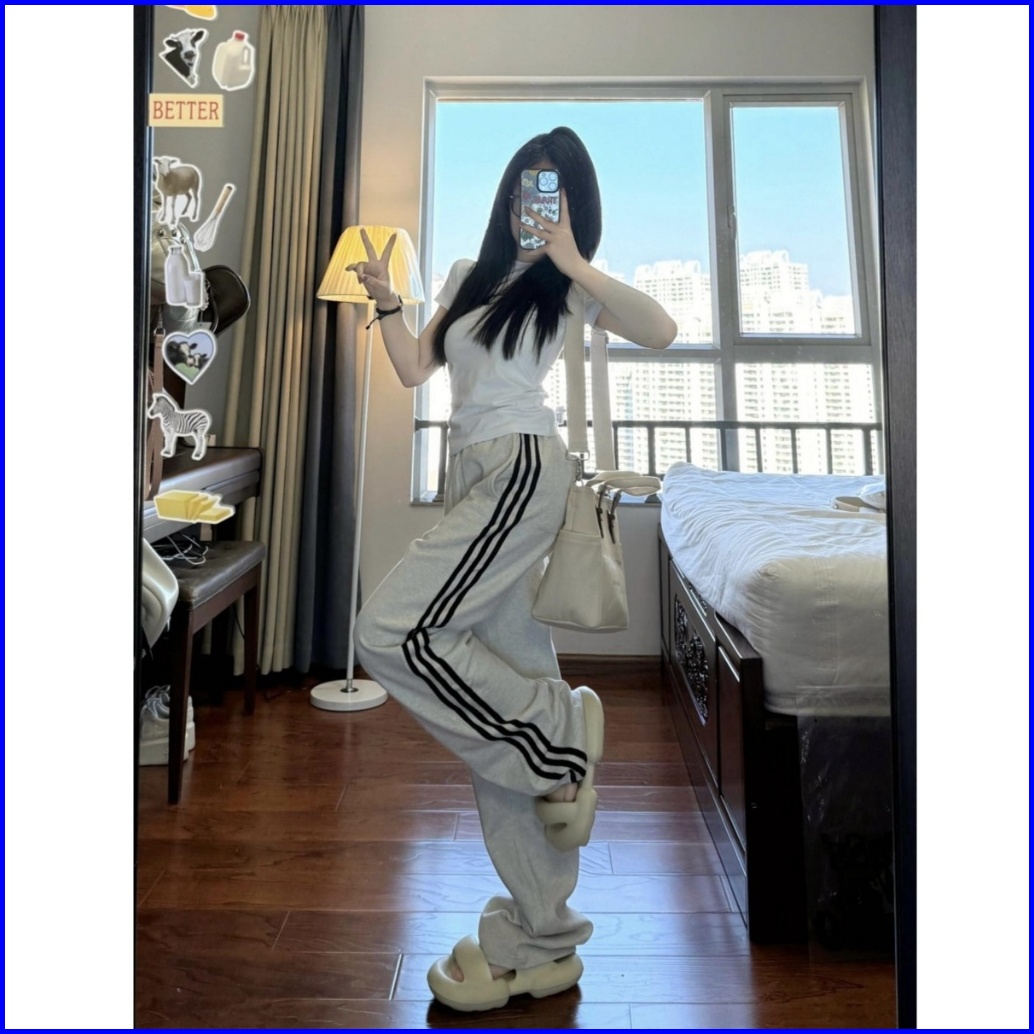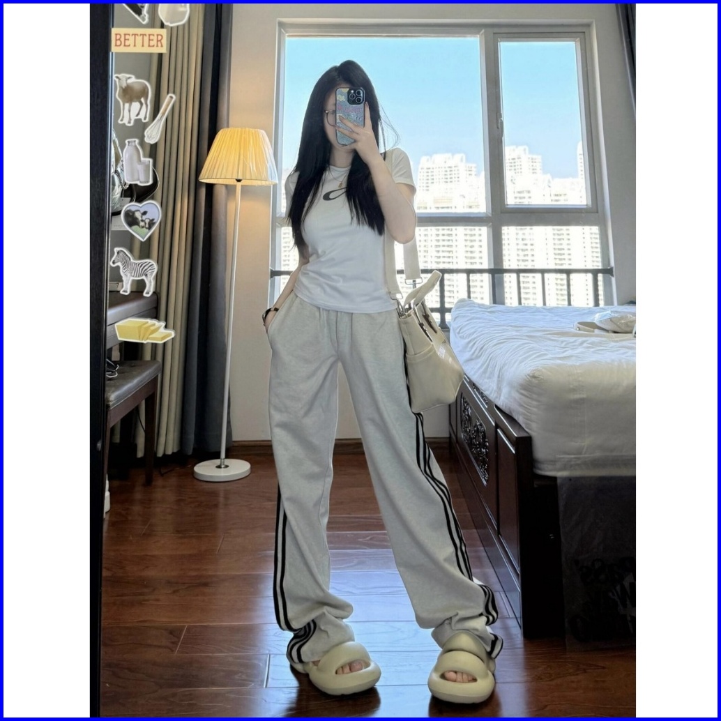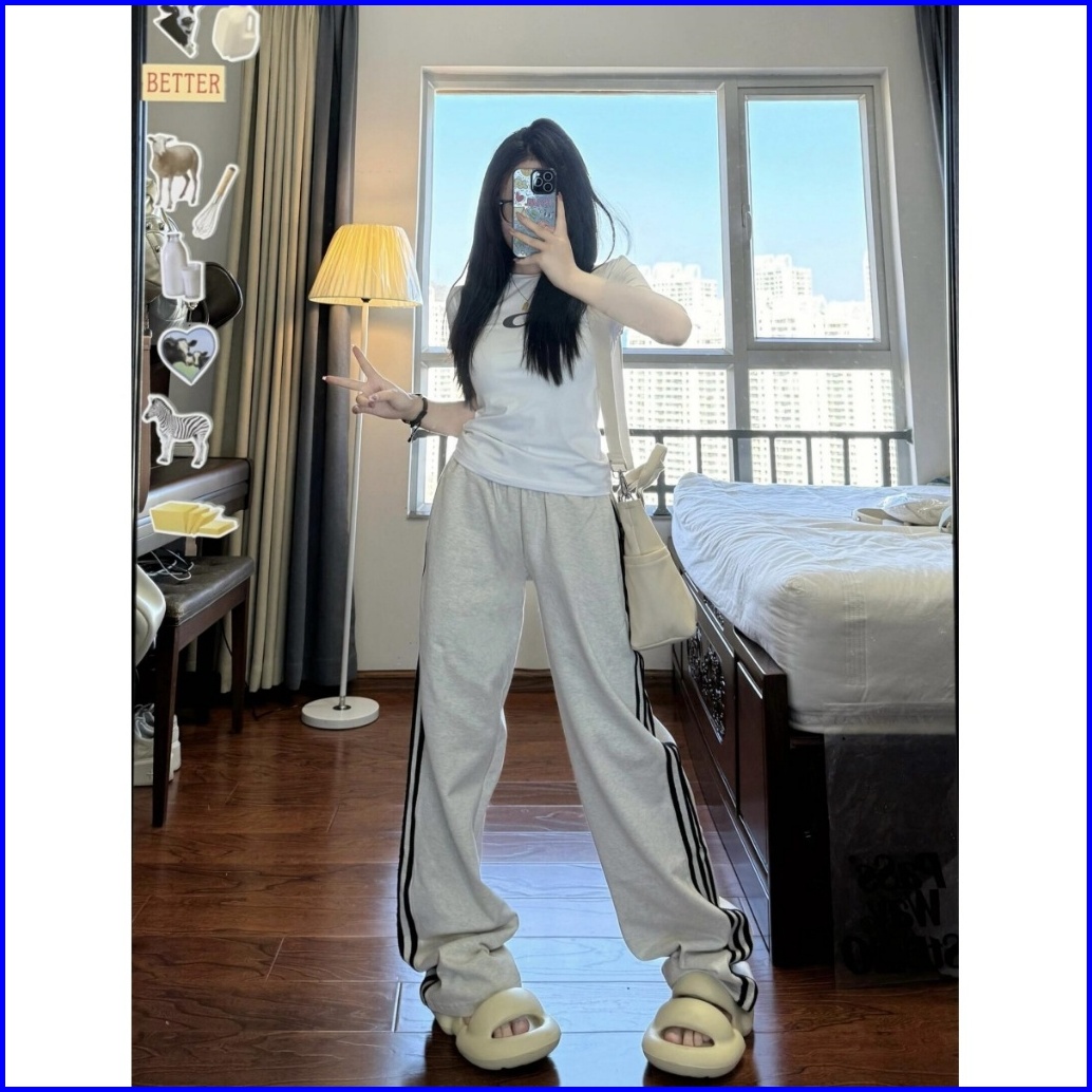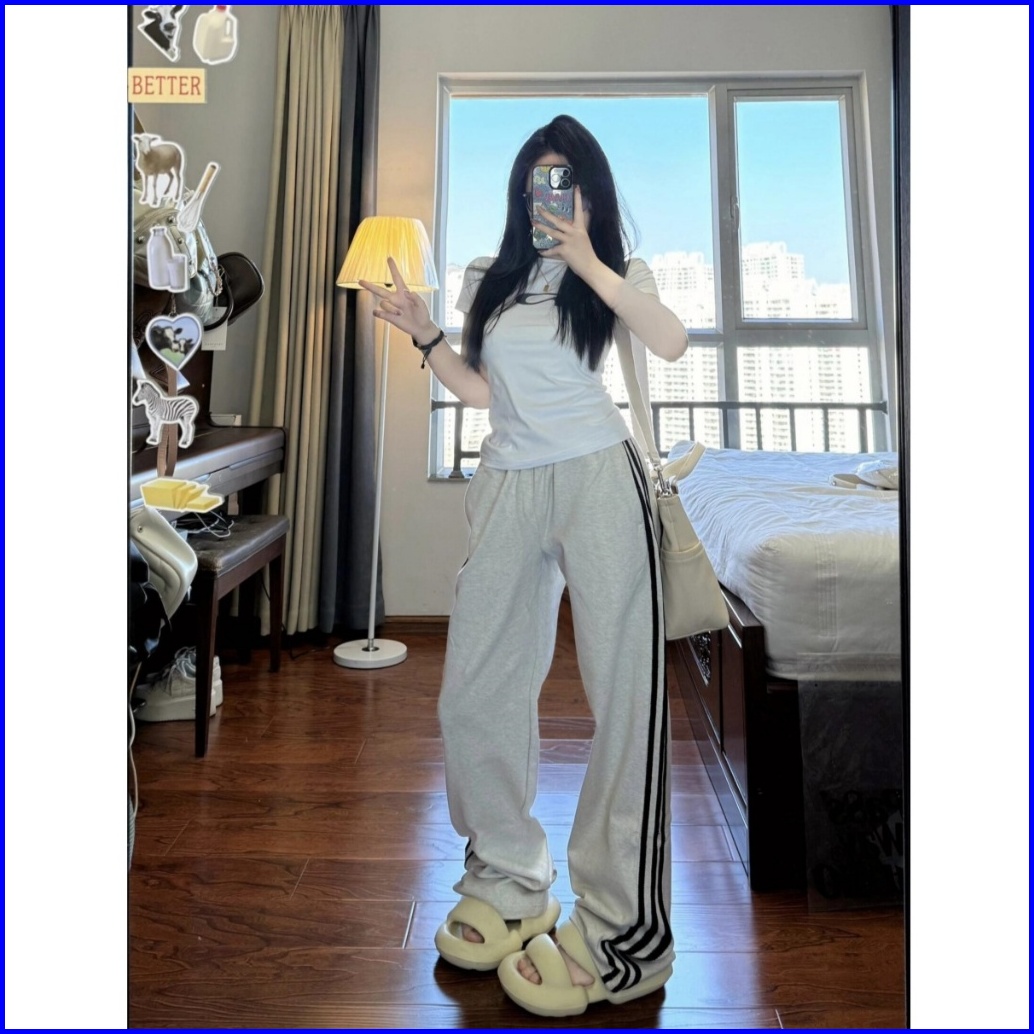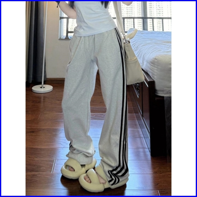 2toyoung Celana Olahraga Abu-abu Korea Celana Panjang Tiga Bar Wanita Celana Olahraga Kaki Lebar Longgar