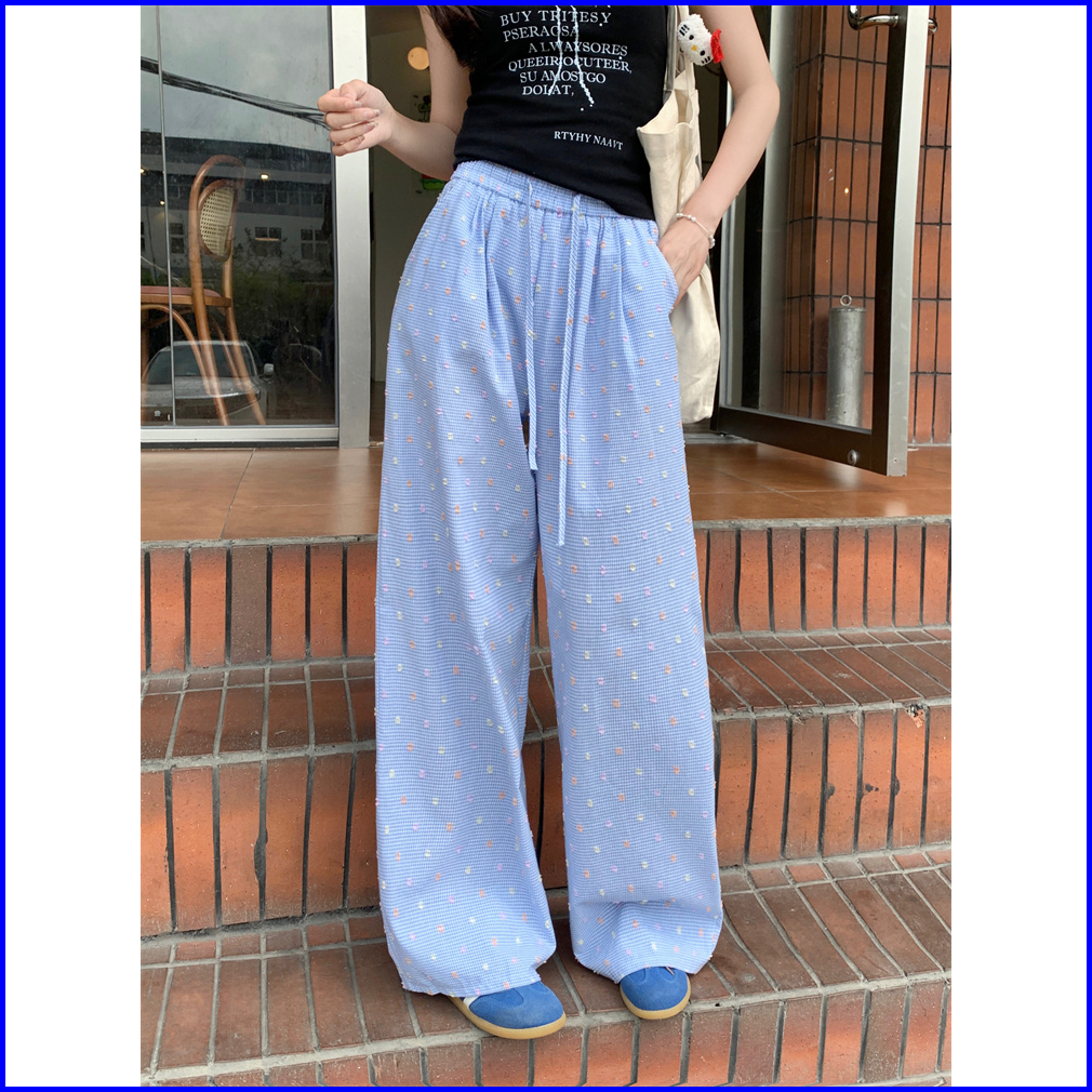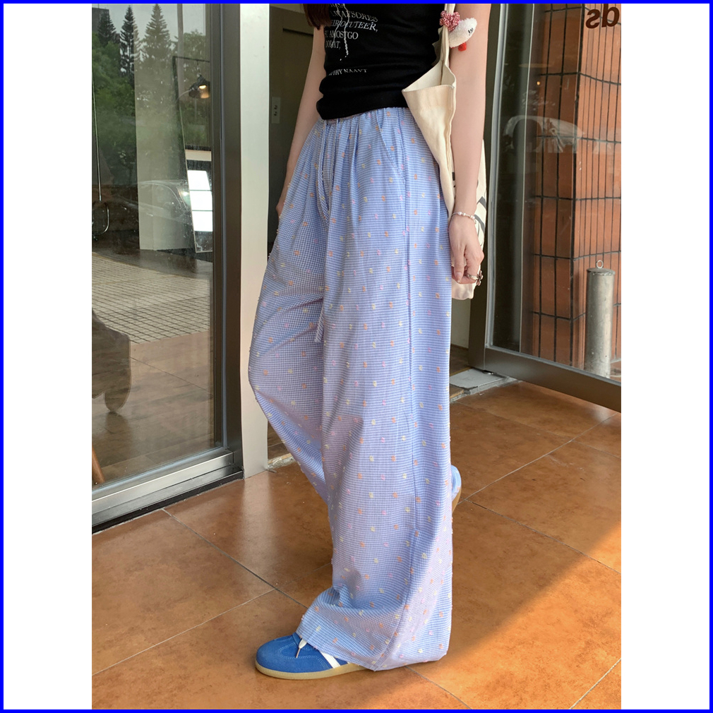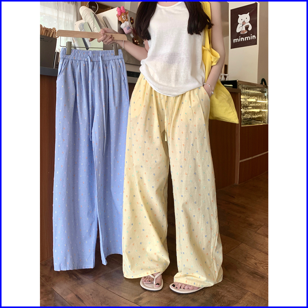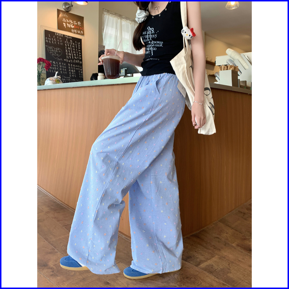 2toyoung Biru Celana Panjang Santai Wanita Dengan Pola Kotak-kotak Dan Polka Dot Model Lebar Musim Panas Celana Wanita K
