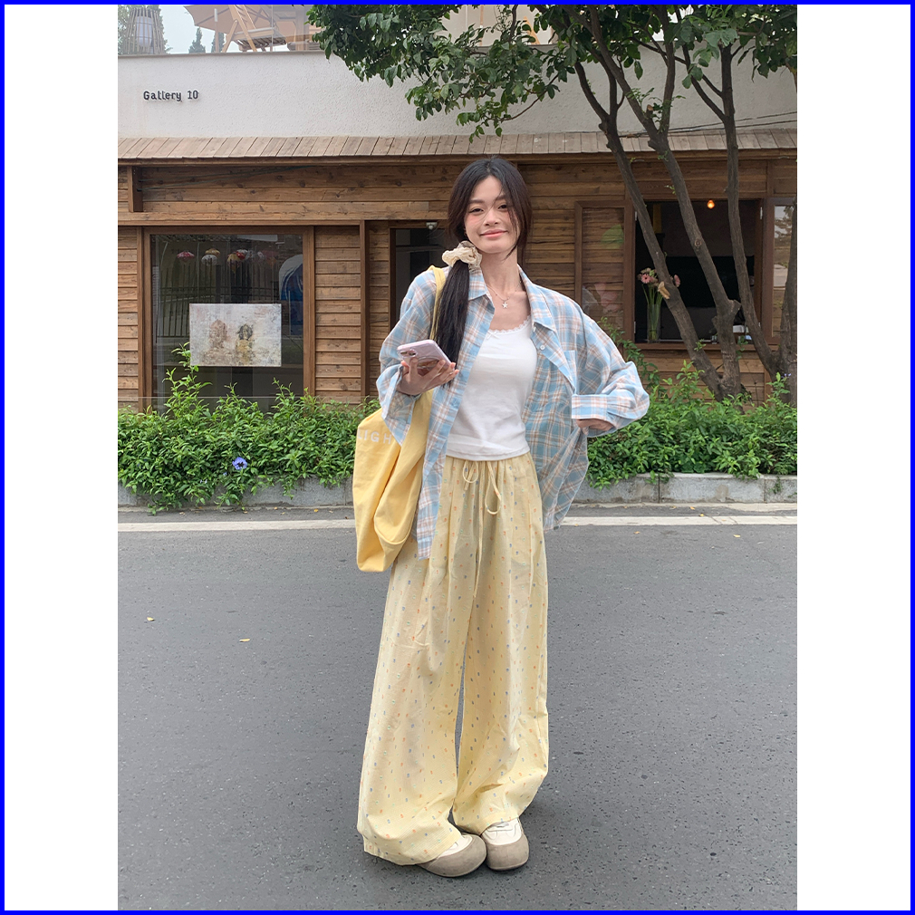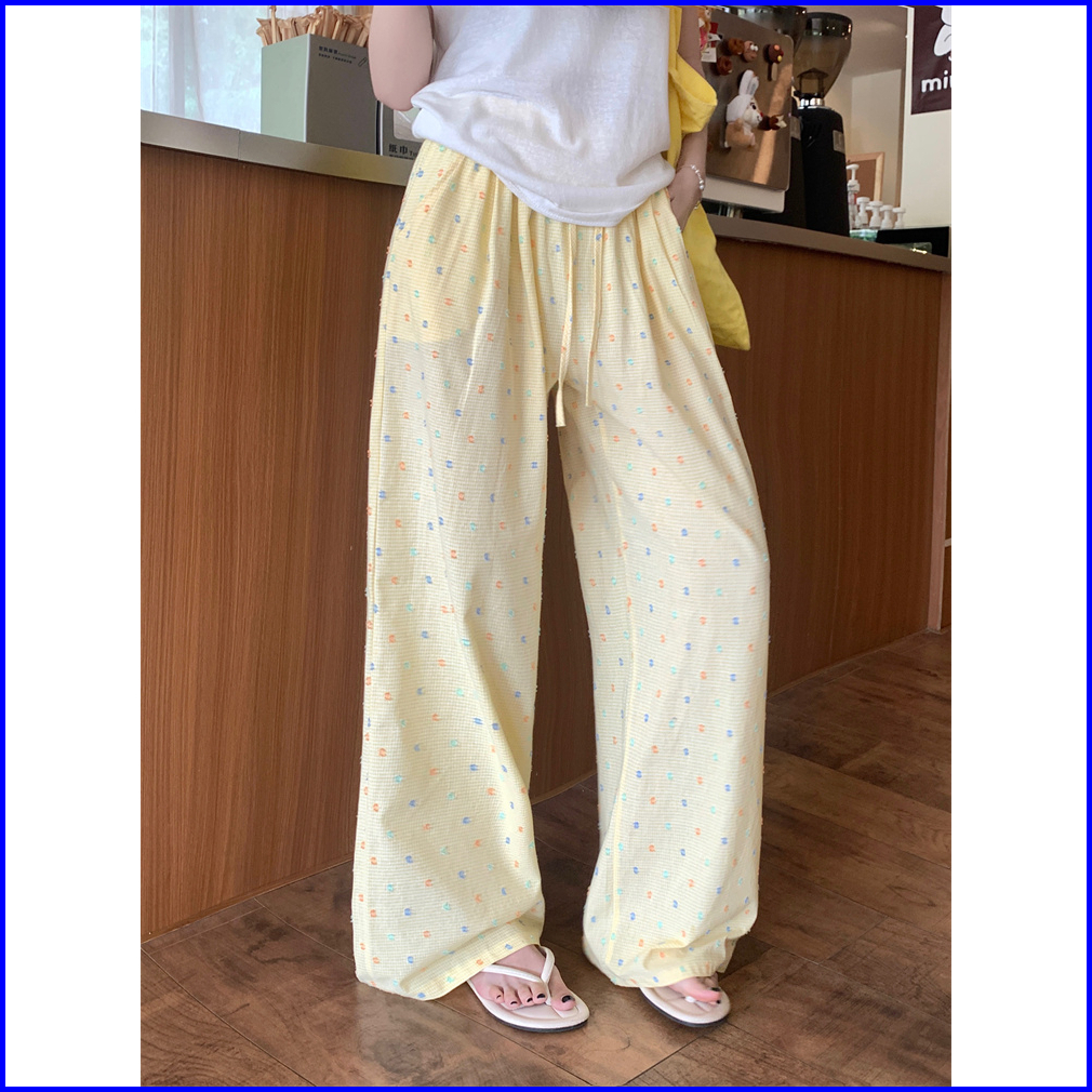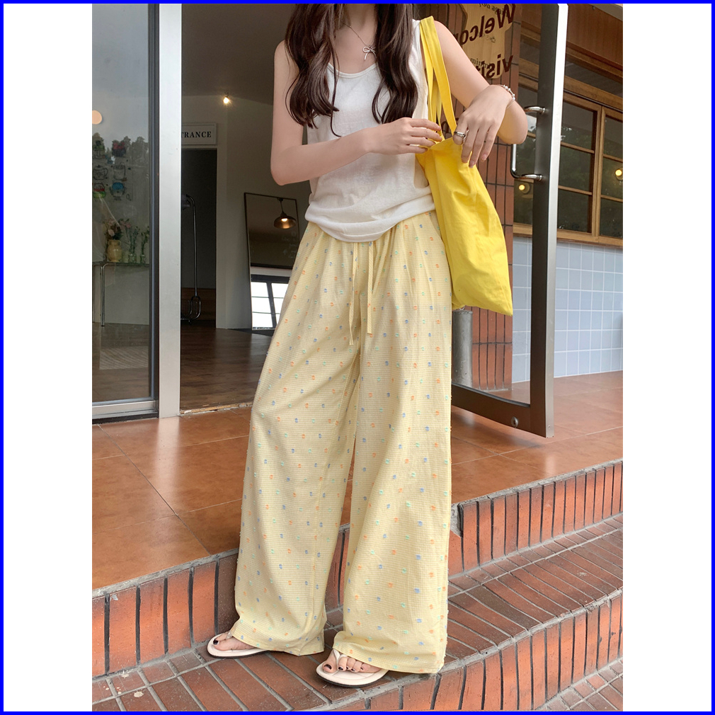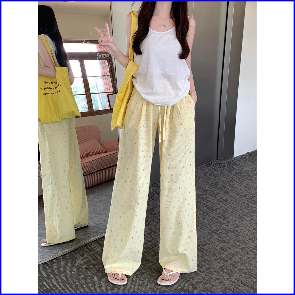 2toyoung Biru Celana Panjang Santai Wanita Dengan Pola Kotak-kotak Dan Polka Dot Model Lebar Musim Panas Celana Wanita K