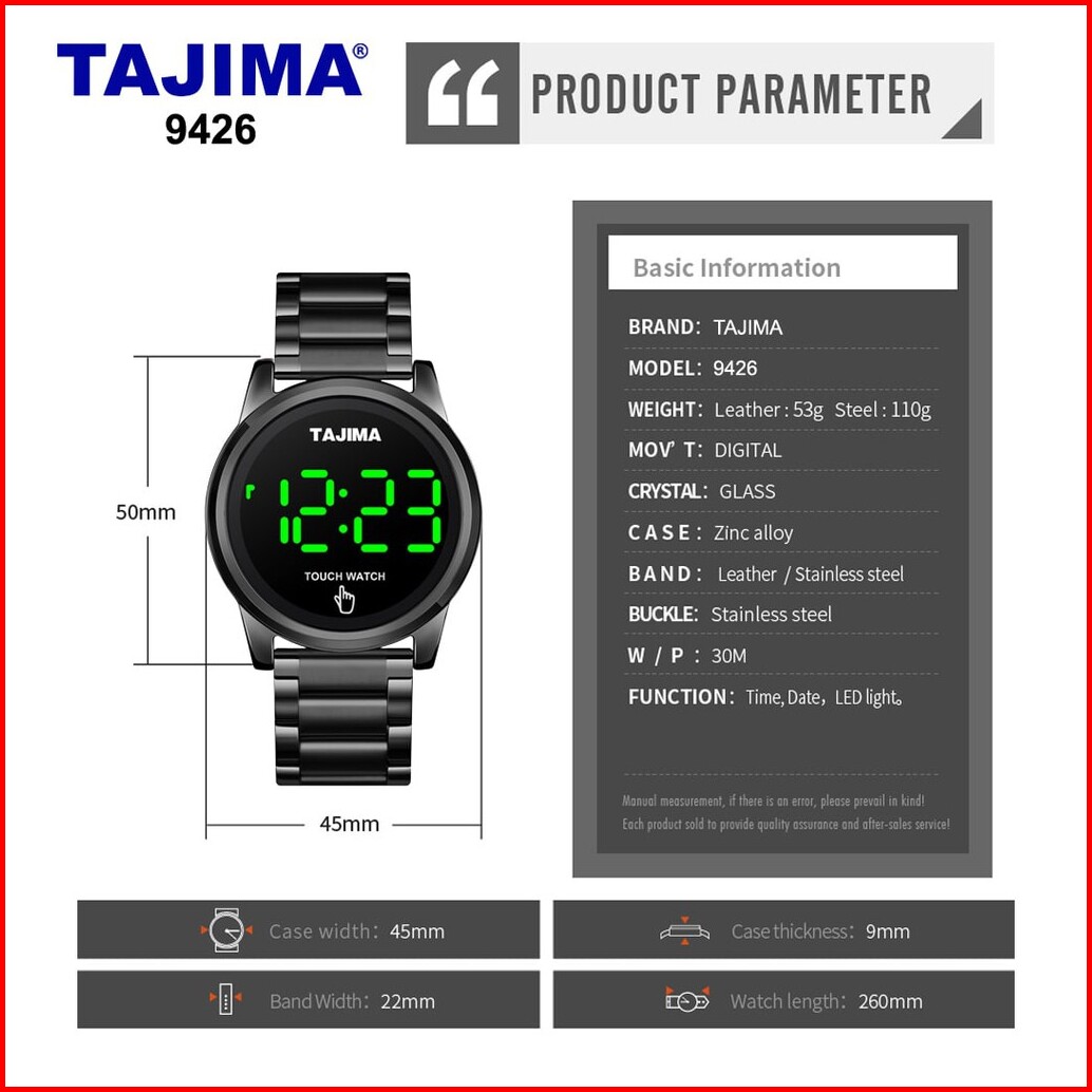 Tajima Jam Tangan Digital Touch Screen Led 9426 Stainless Steel Tahan Air 50 Meter Original Garansi 1 Tahun Free Box
