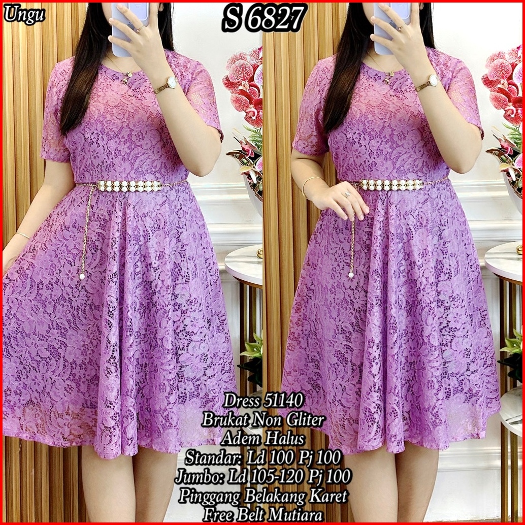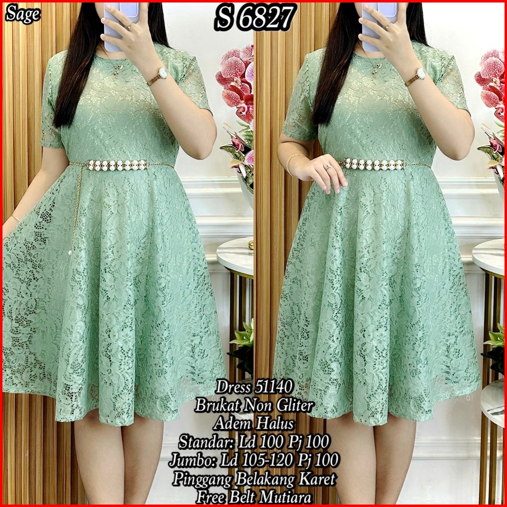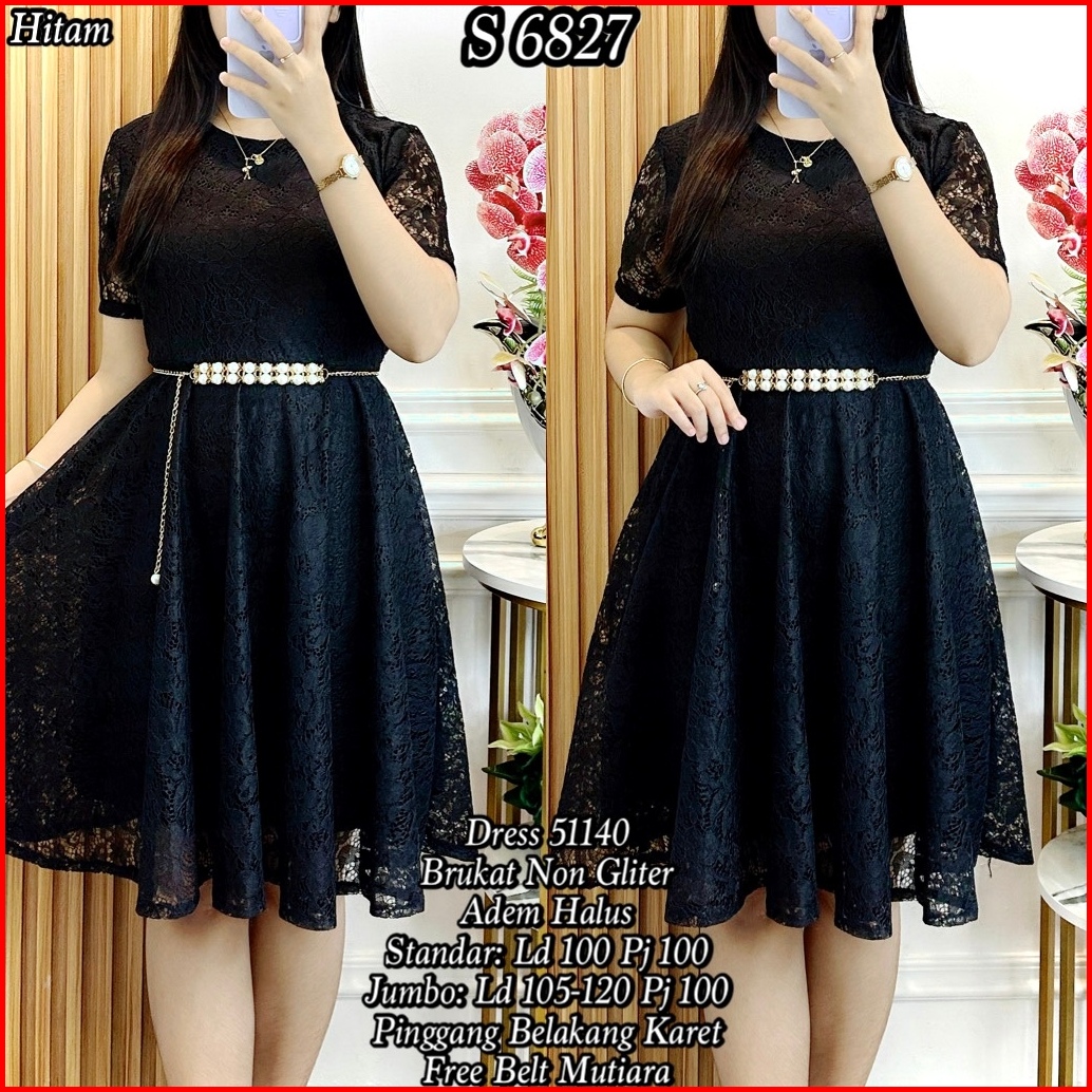 S 6827 Dress Midi Brukat Polos Free Belt Standar-jumbo 51440