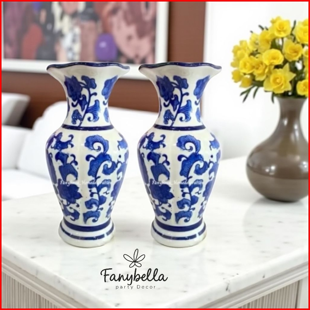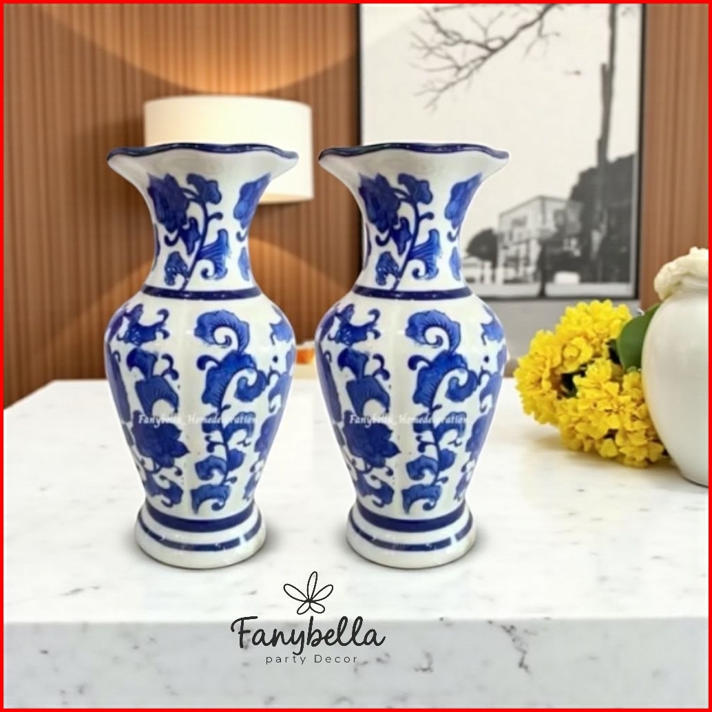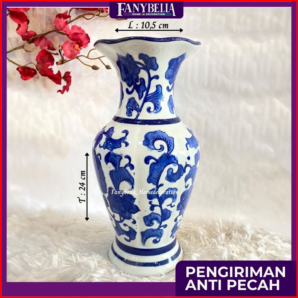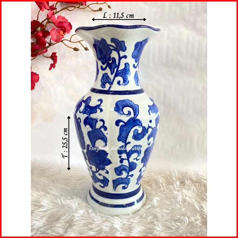 Vas Bunga Keramik Guci Mini Putih Biru Motif Bunga Ukuran 25 Cm Aesthetic Dekorasi Rumah Import