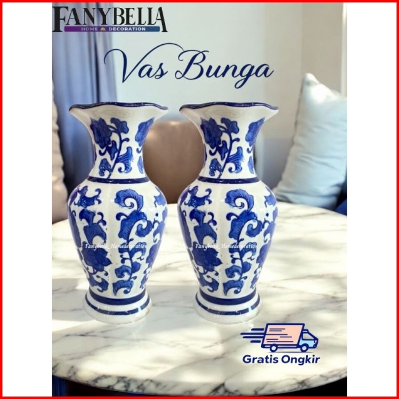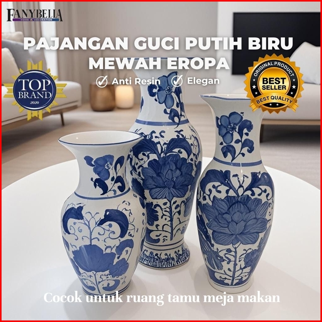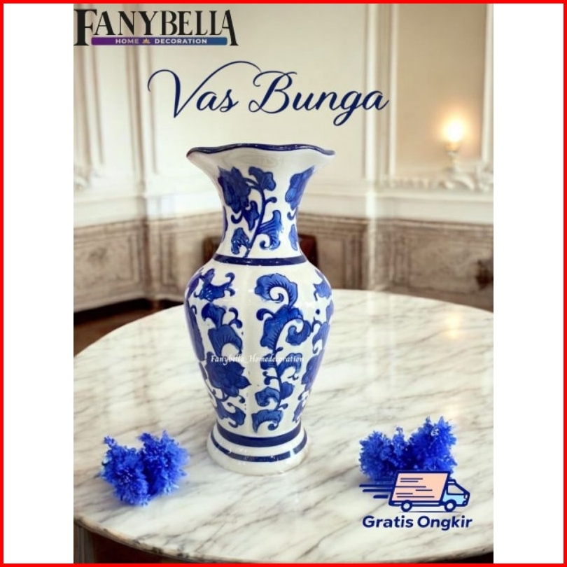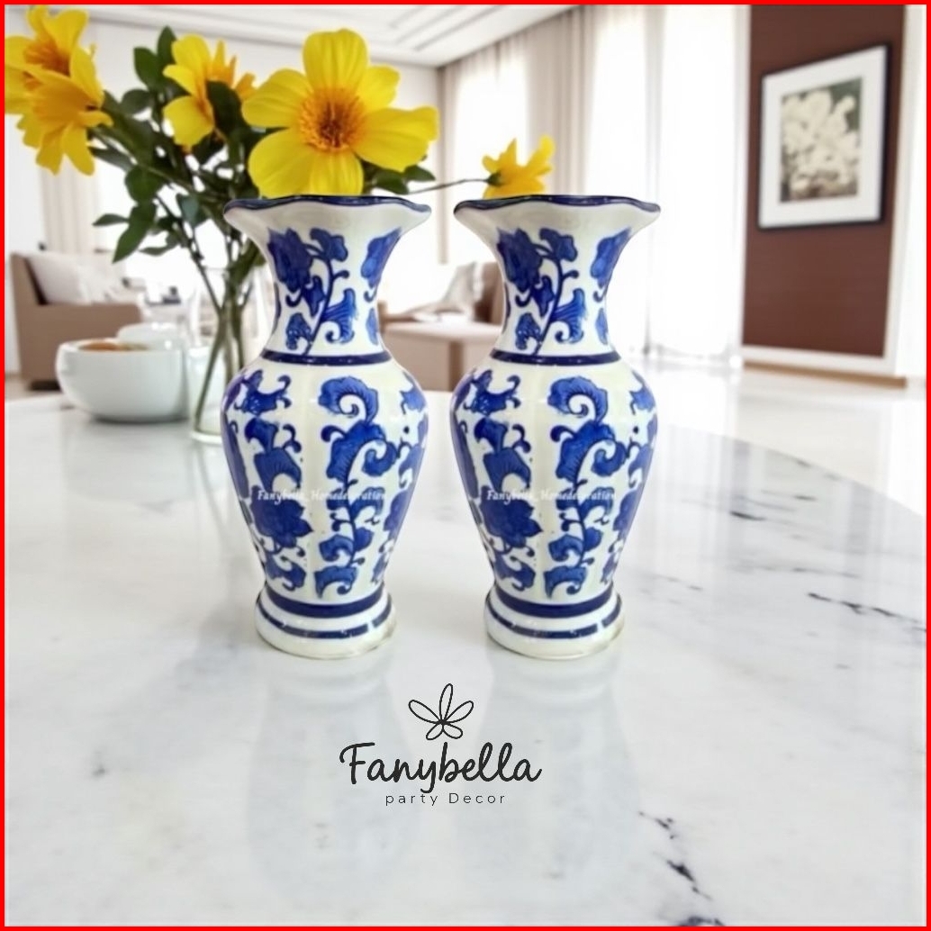 Vas Bunga Keramik Guci Mini Putih Biru Motif Bunga Ukuran 25 Cm Aesthetic Dekorasi Rumah Import