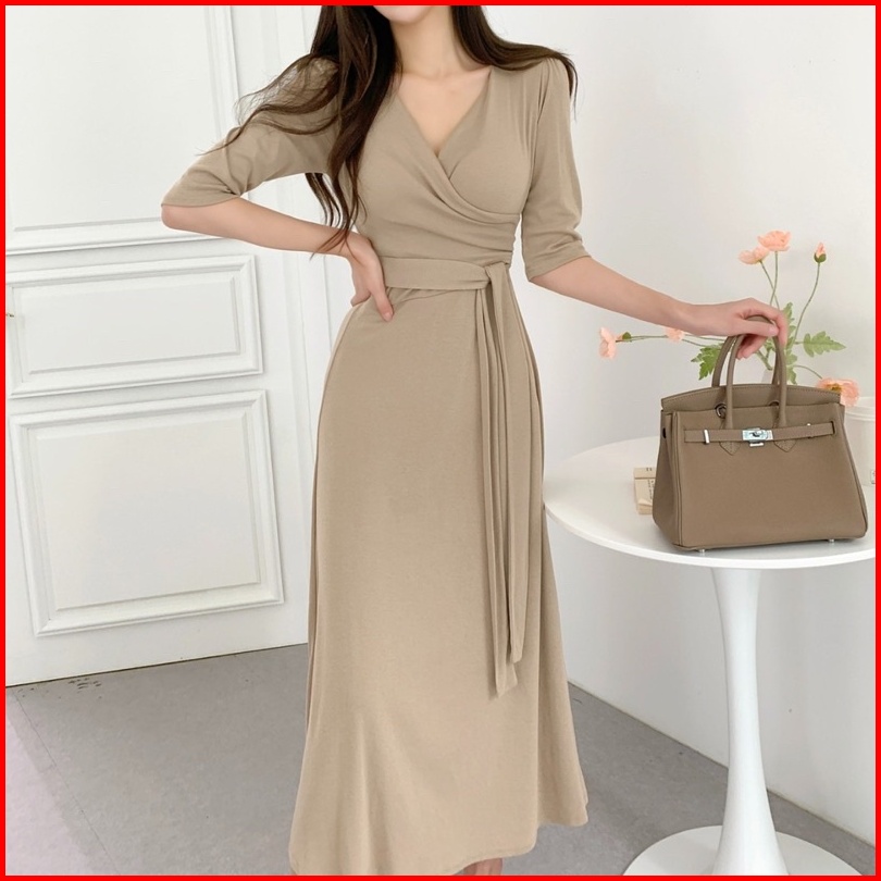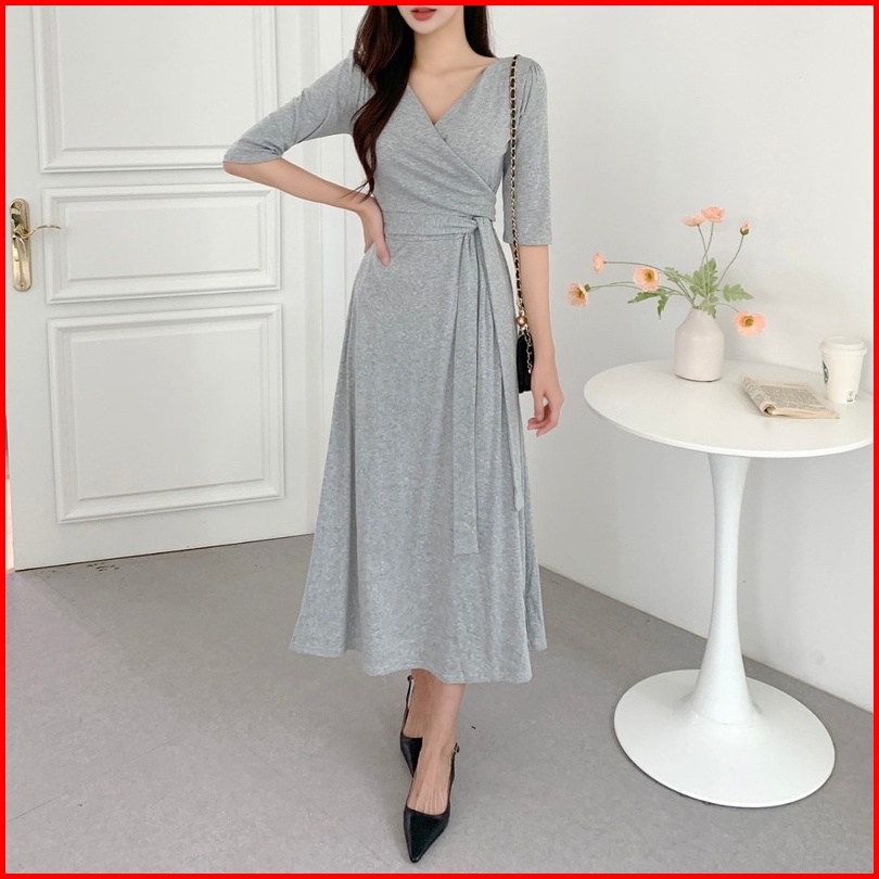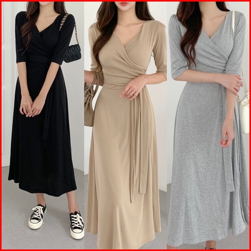 Ada Size Jumbo D1083 Medali Korean Style Vintage Midi Dress Polos Stretch Bumil Busui Hijab