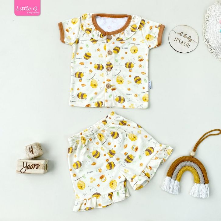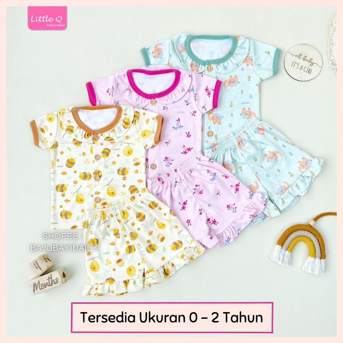 3 STEL SML MOTIF SETELAN STELAN SET PAKAIAN BAJU LENGAN PENDEK RUFFLE REMPEL KANCING DEPAN CELANA PENDEK ANAK BAYI PERE
