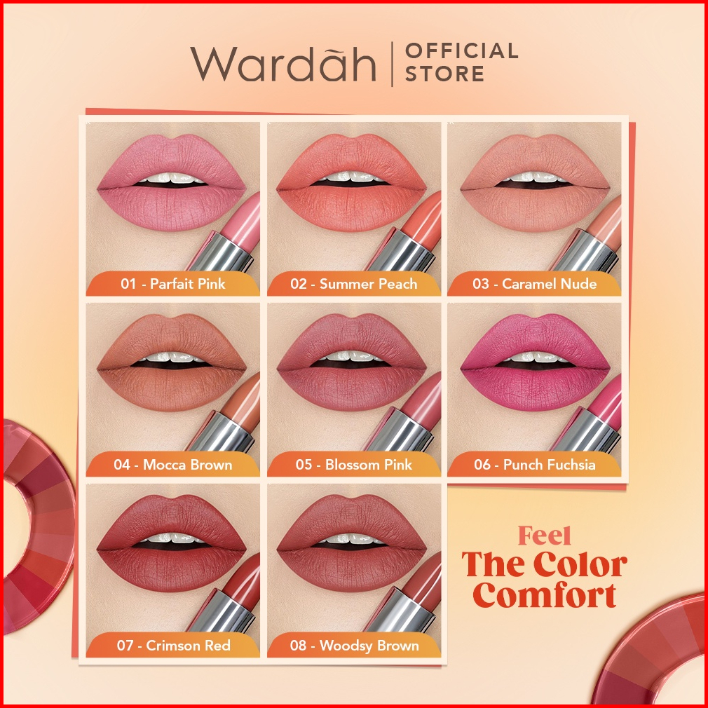 01(parfait pink), 02(summerpeach), 03(caramel nude), 04(mocca brown), 05(blossom pink), 06(punch fuchsia), 07(crimson red), 08(woodsy brown)