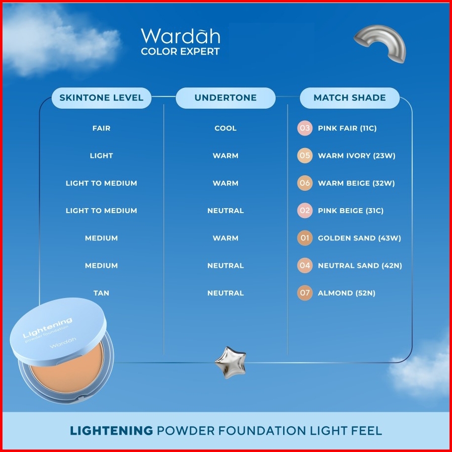 01 Golden Sand (43W), 02 Pink Beige (31C), 03 Pink Fair (11C), 04 Neutral Sand(42N), 05 Warm Ivory (23W), 06 Warm Beige (32W), 07 Almond (52N)