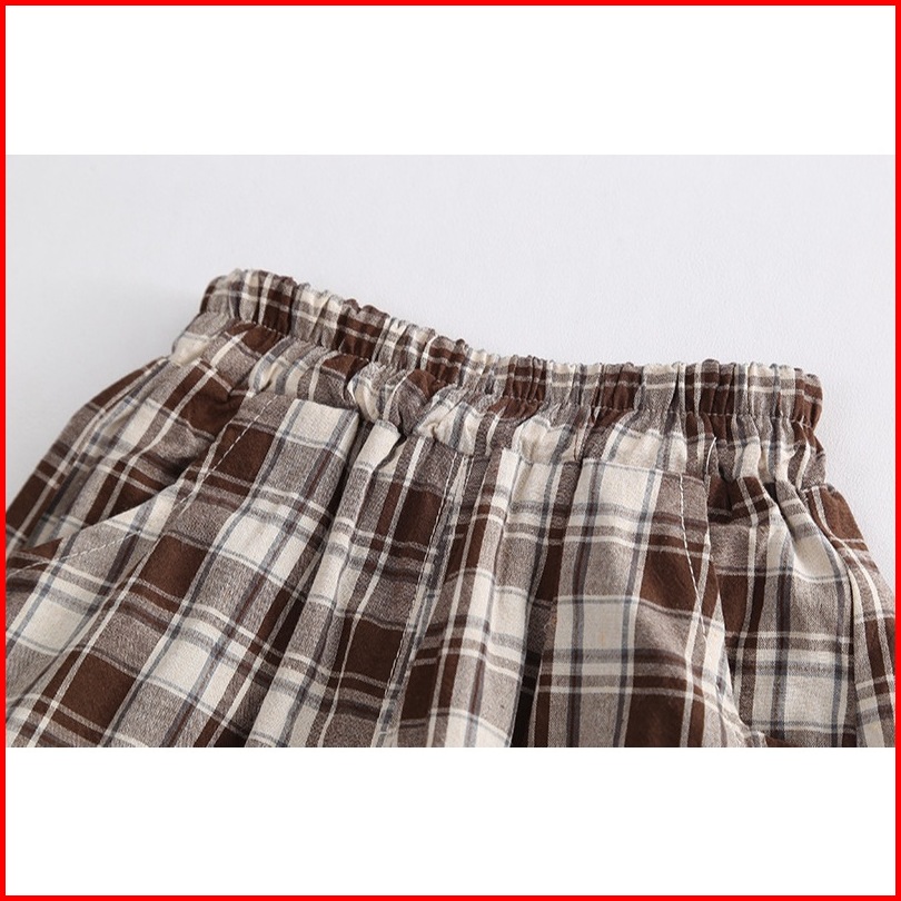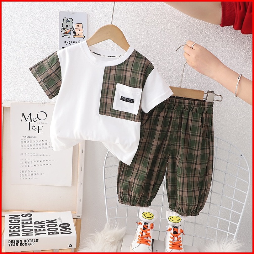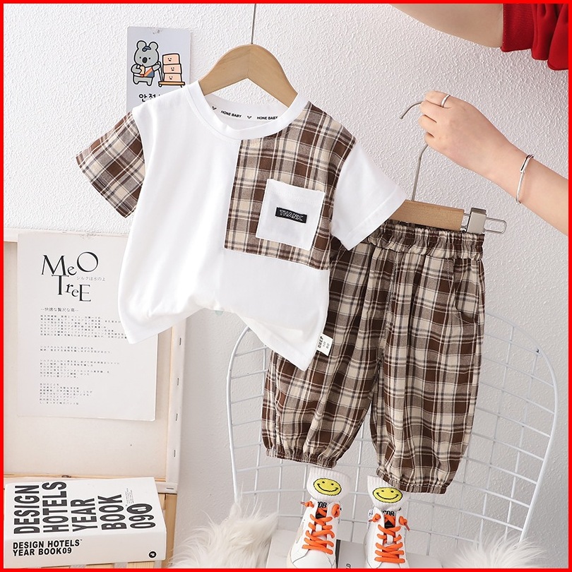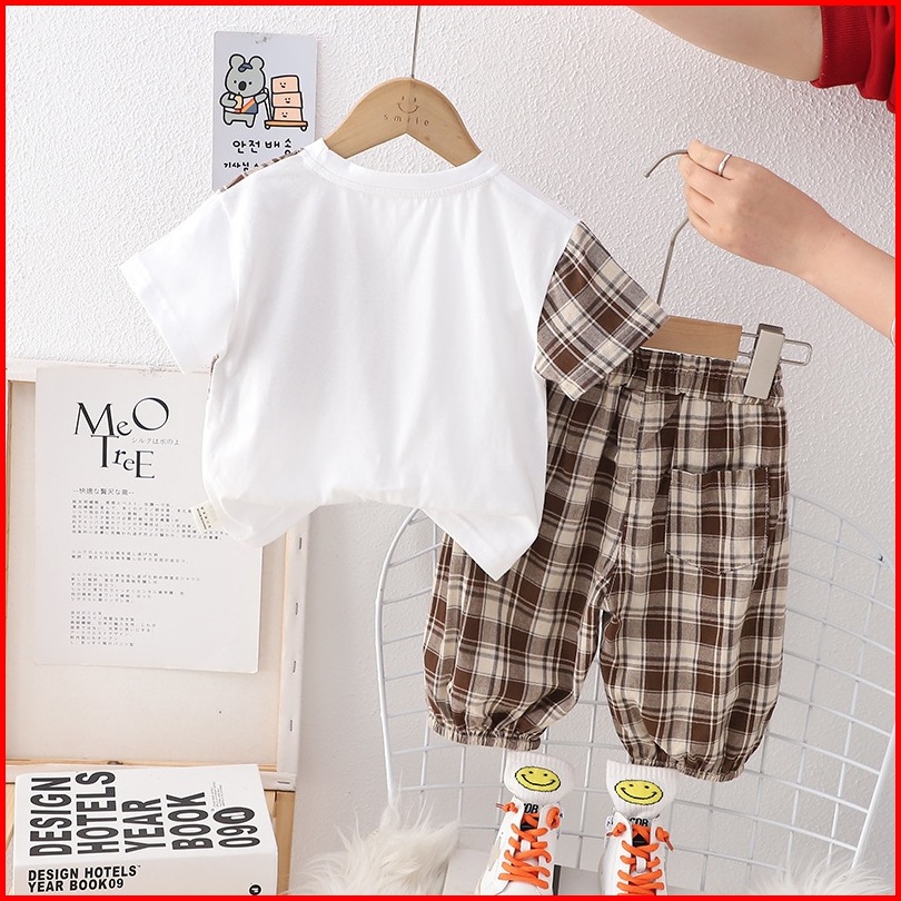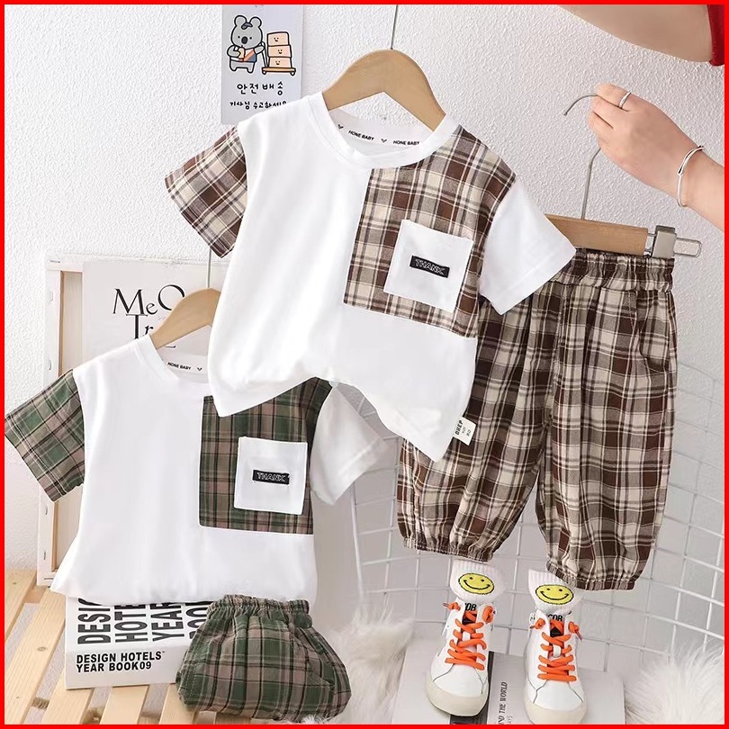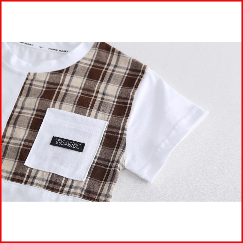 Setelan Kaos Anak Laki Laki Import Stelan Kaos Lengan Pendek Motif Kotak Kotak Kantong Putih Tulisan Thank Anak Cowok Im