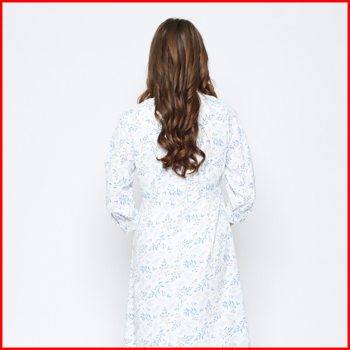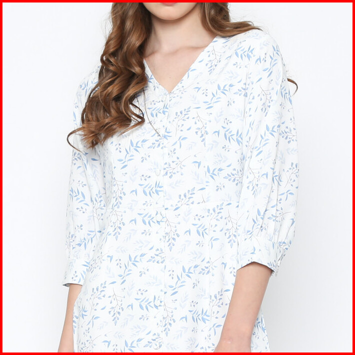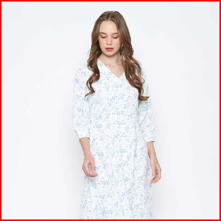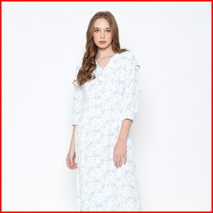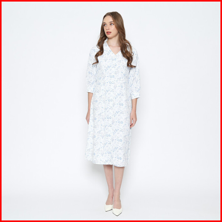 Valino Ladies Dress Midi V Neck Putih Motif Biru Floral Wanita - D-cdbk28-n5