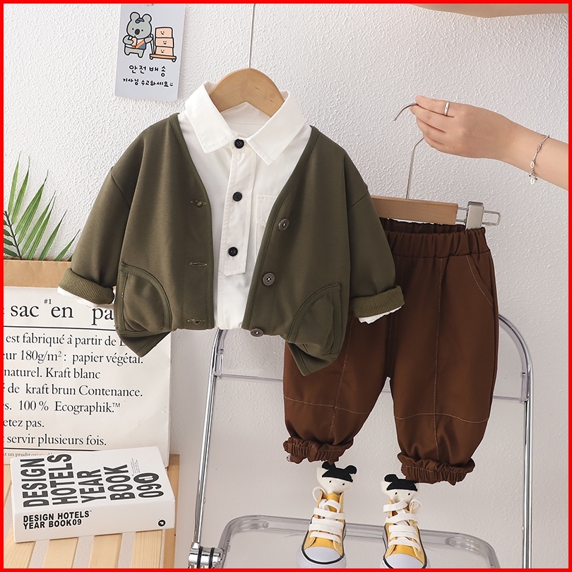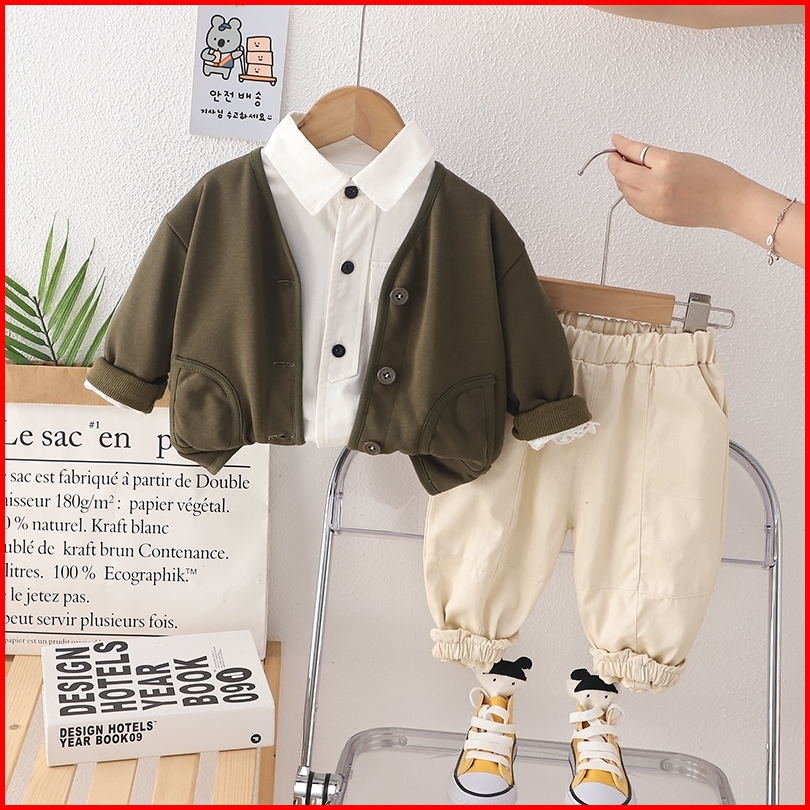 Setelan Jaket Kemeja Anak Laki Laki Import Setelan Kemeja Jaket Cardigan Hijau Army Anak Impor Setelan 3pcs Jaket Dengan