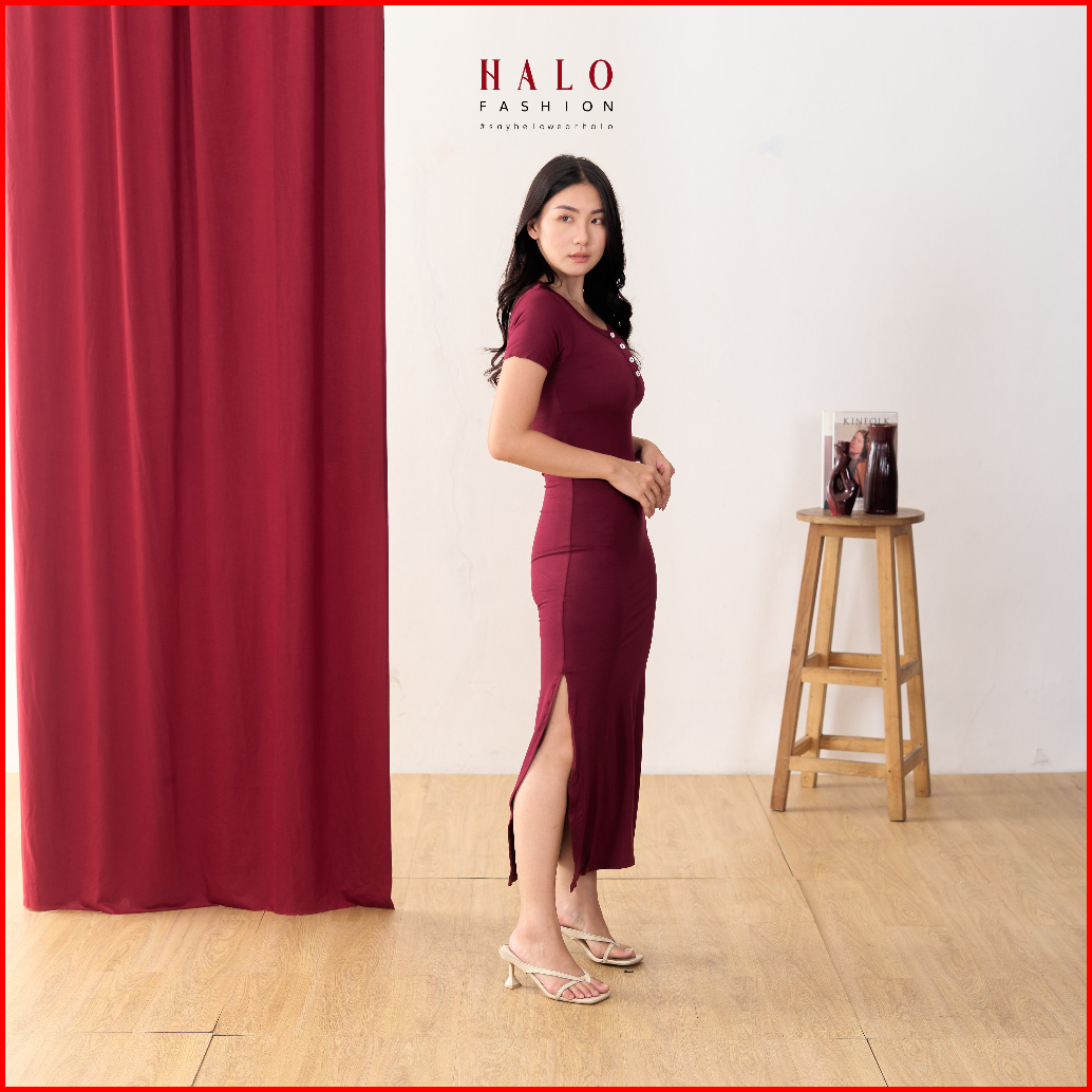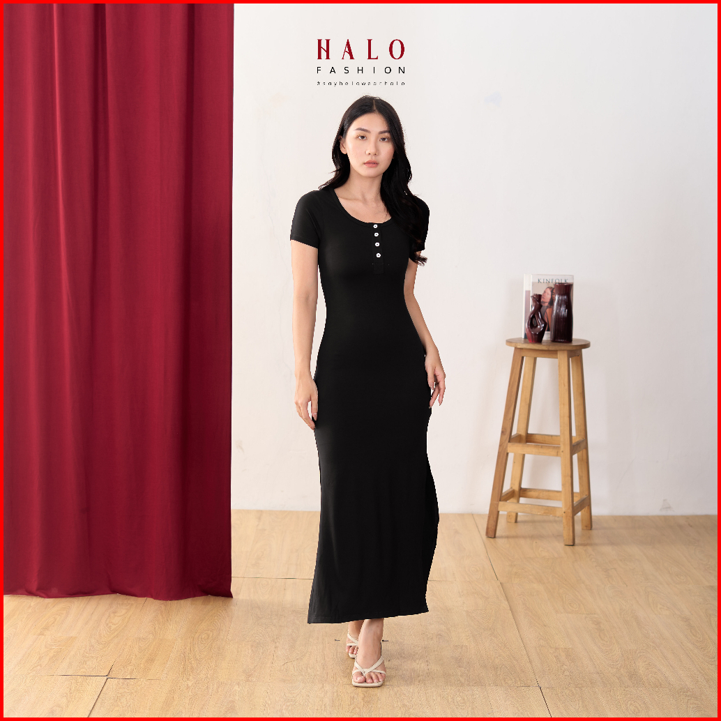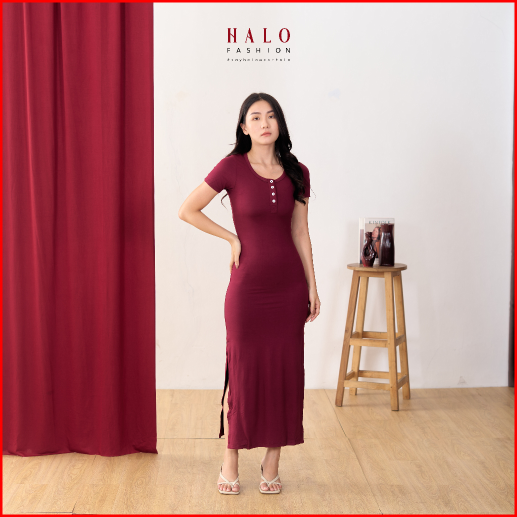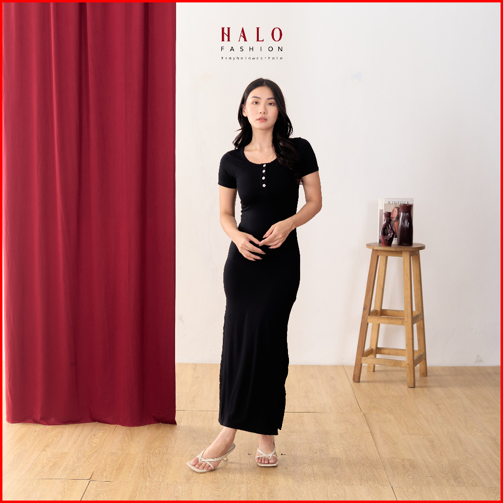 Halofashion Siva Dress Bodycon Slit Long Dress Button Short Slevee Casual Dress Wanita