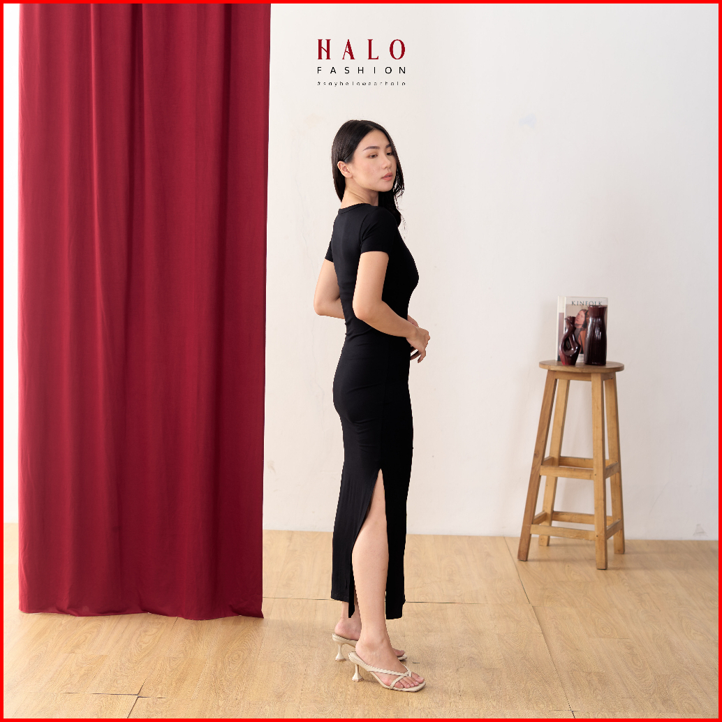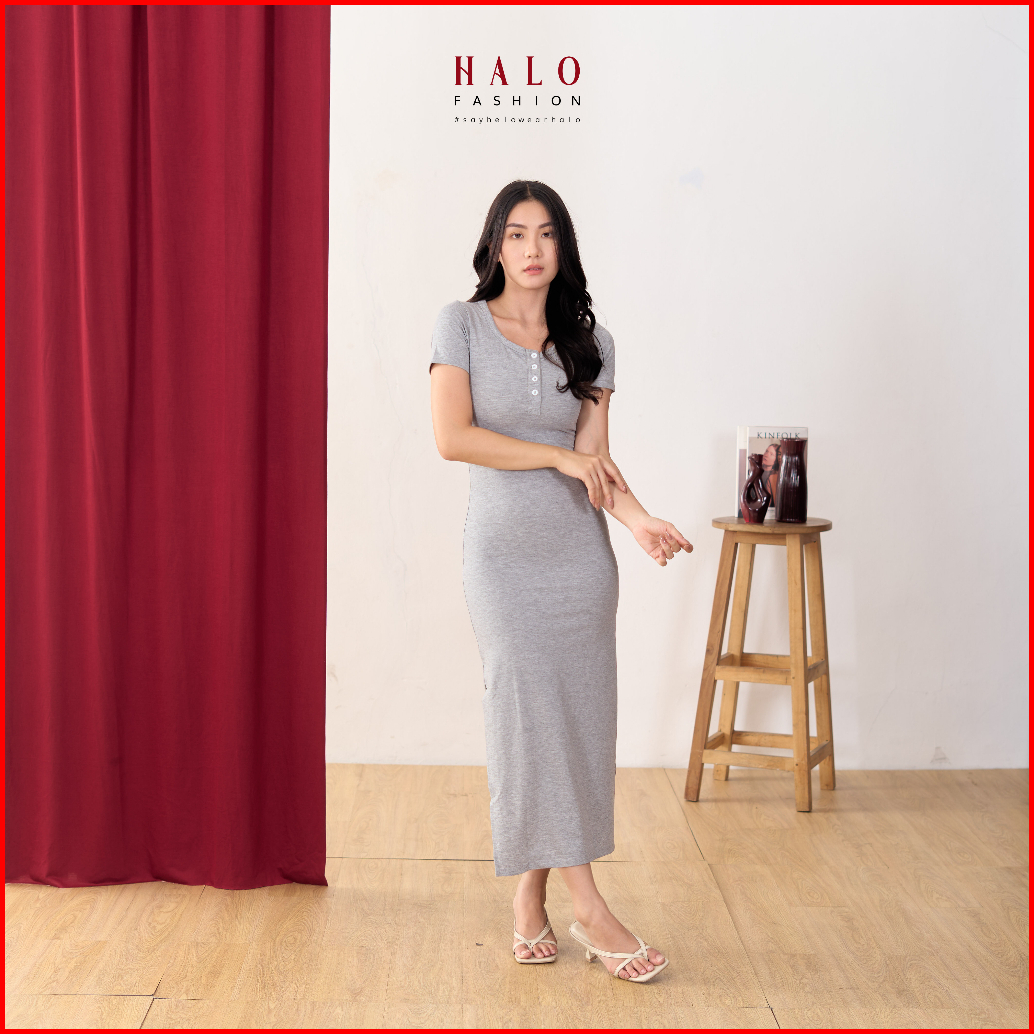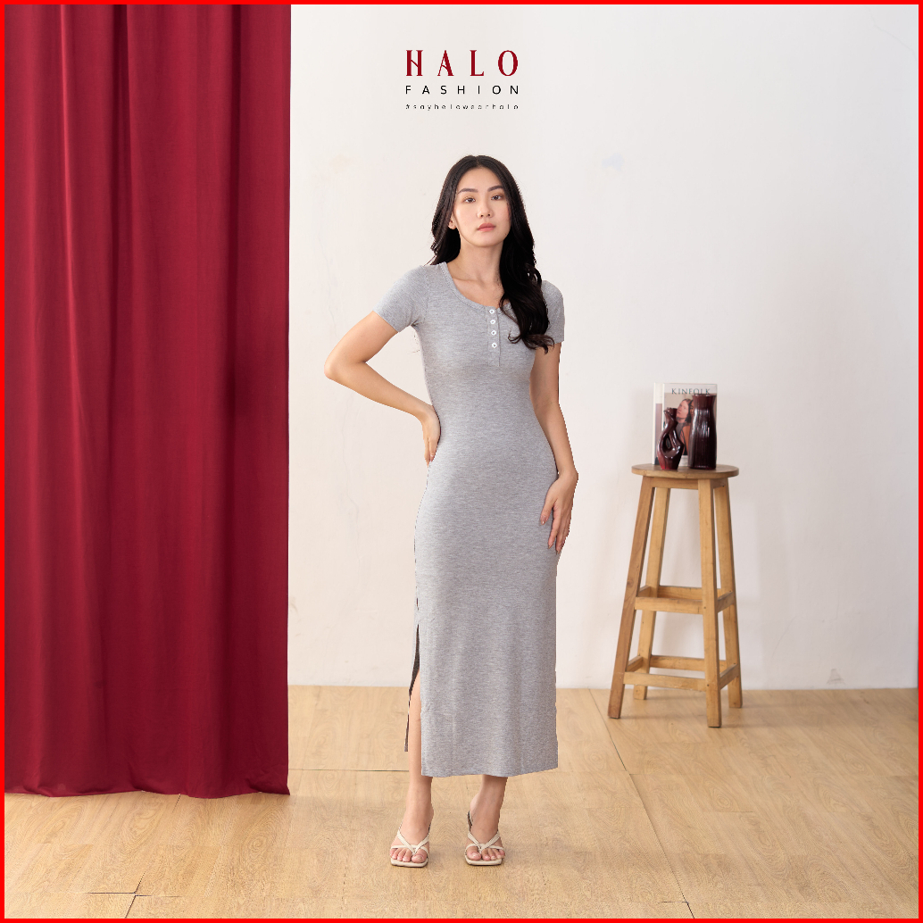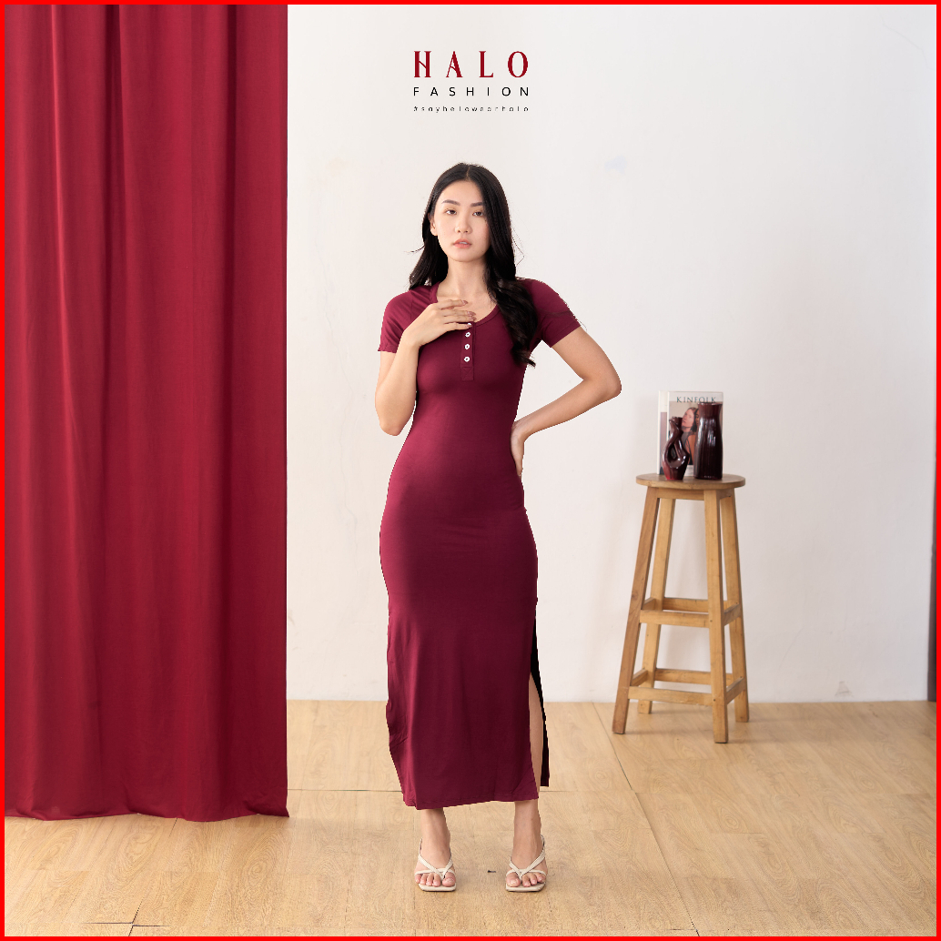 Halofashion Siva Dress Bodycon Slit Long Dress Button Short Slevee Casual Dress Wanita